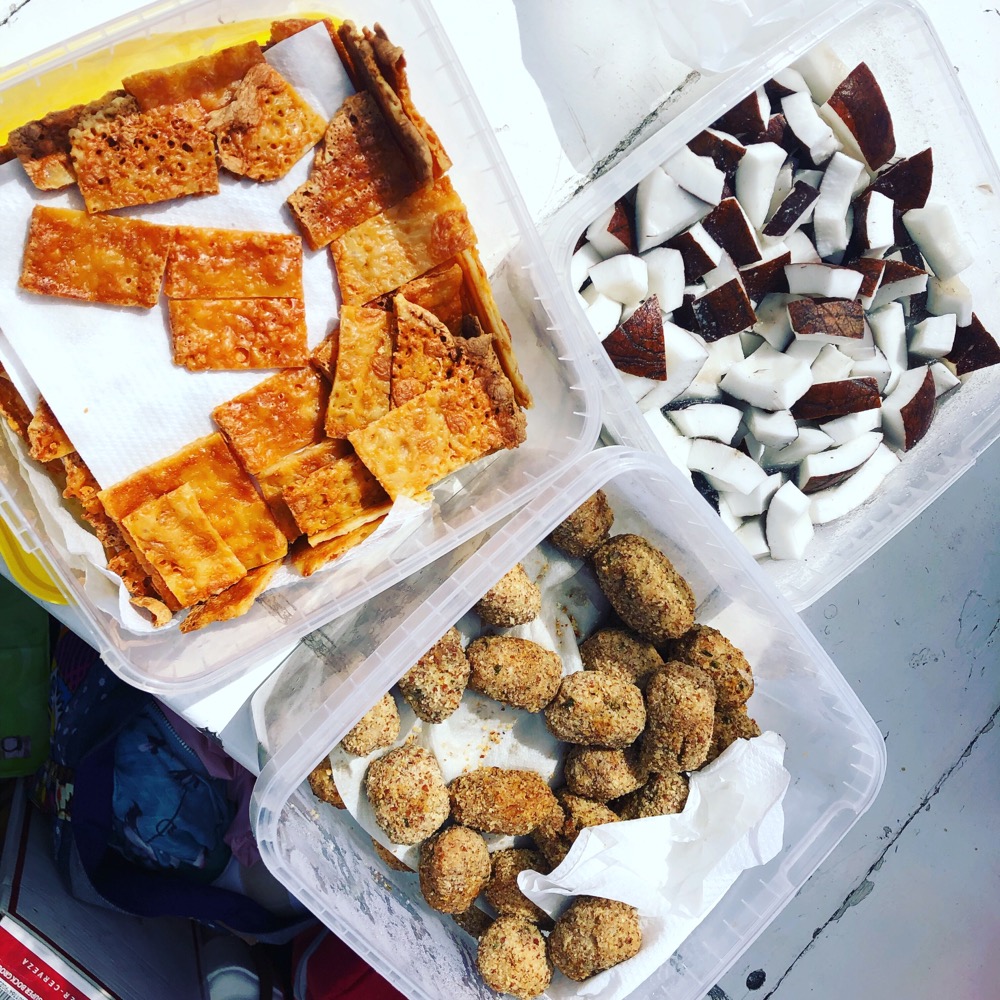 Croquetes de peru, chips de queijo e coco fresco!
