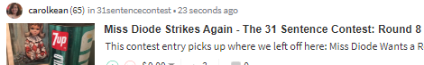 https://steemit.com/31sentencecontest/@carolkean/miss-diode-strikes-again-the-31-sentence-contest-round-8 oops, sorry!!