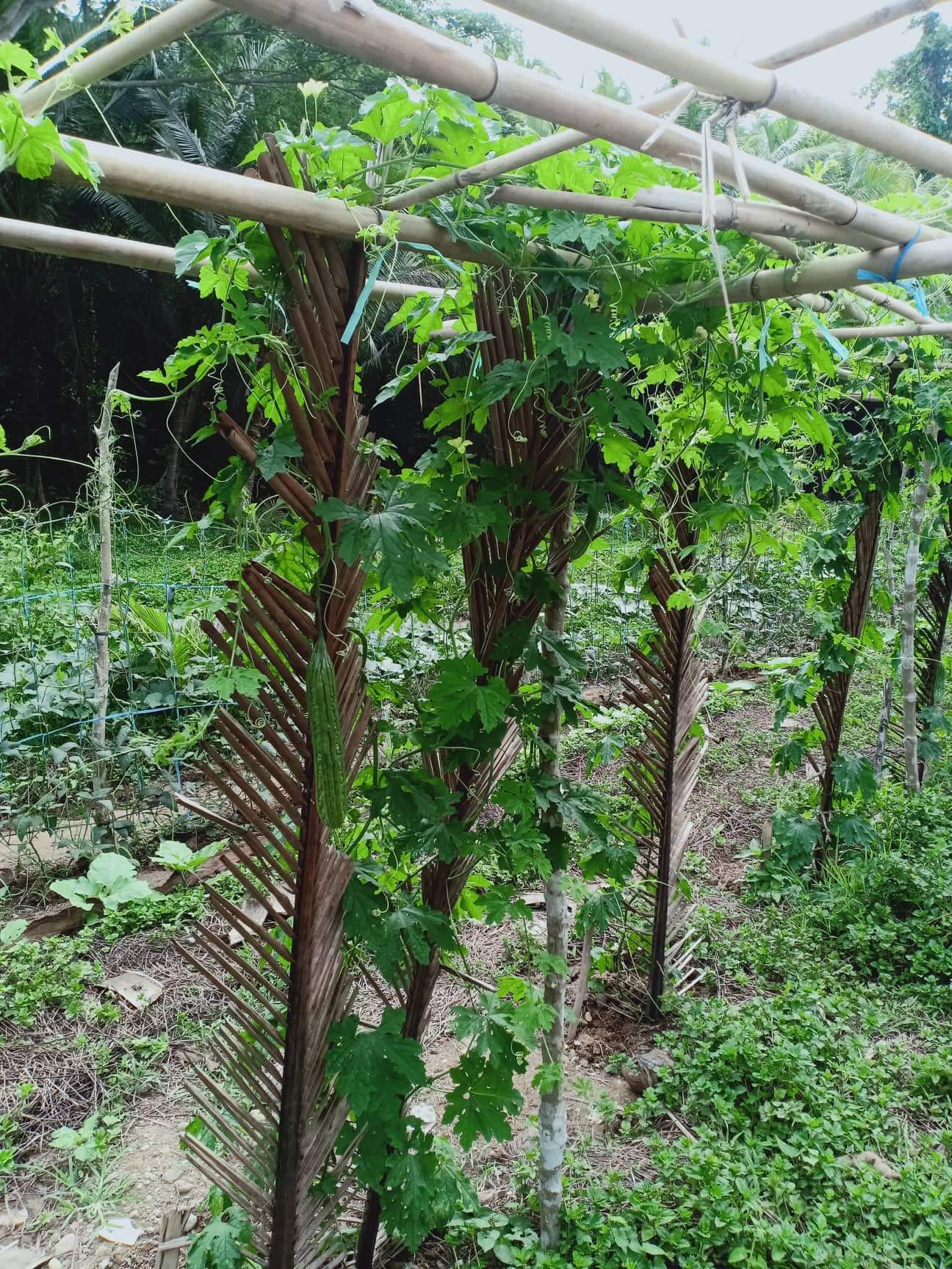 The vine veges, string beans and ampalaya are crawling to the trelis happily bearing fruits.