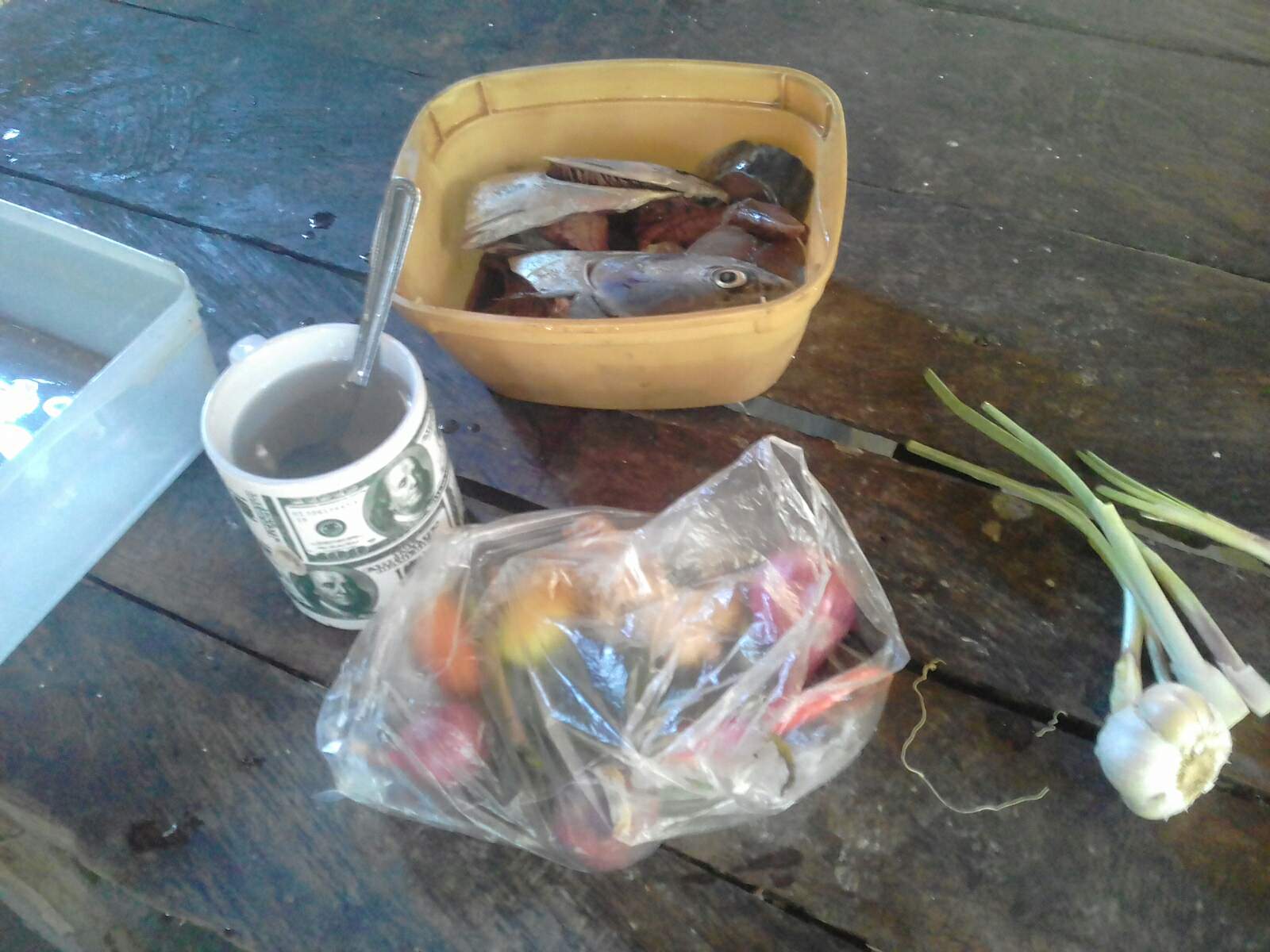 Because I left my breakfast this morning I buy fish to cook for our lunch to bring home. So that my breakfast and lunch I take at once. When I arrive at home my wife who did to cook it.