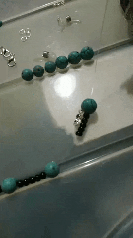 Las piezas grandes van: 2 intervalos de turquesas mediana, 1 turquesa grande, 1 turquesa alargada entre dos canutillos plateados, 1 turquesa grande y 2 intervalos de turquesa mediana nuevamente.