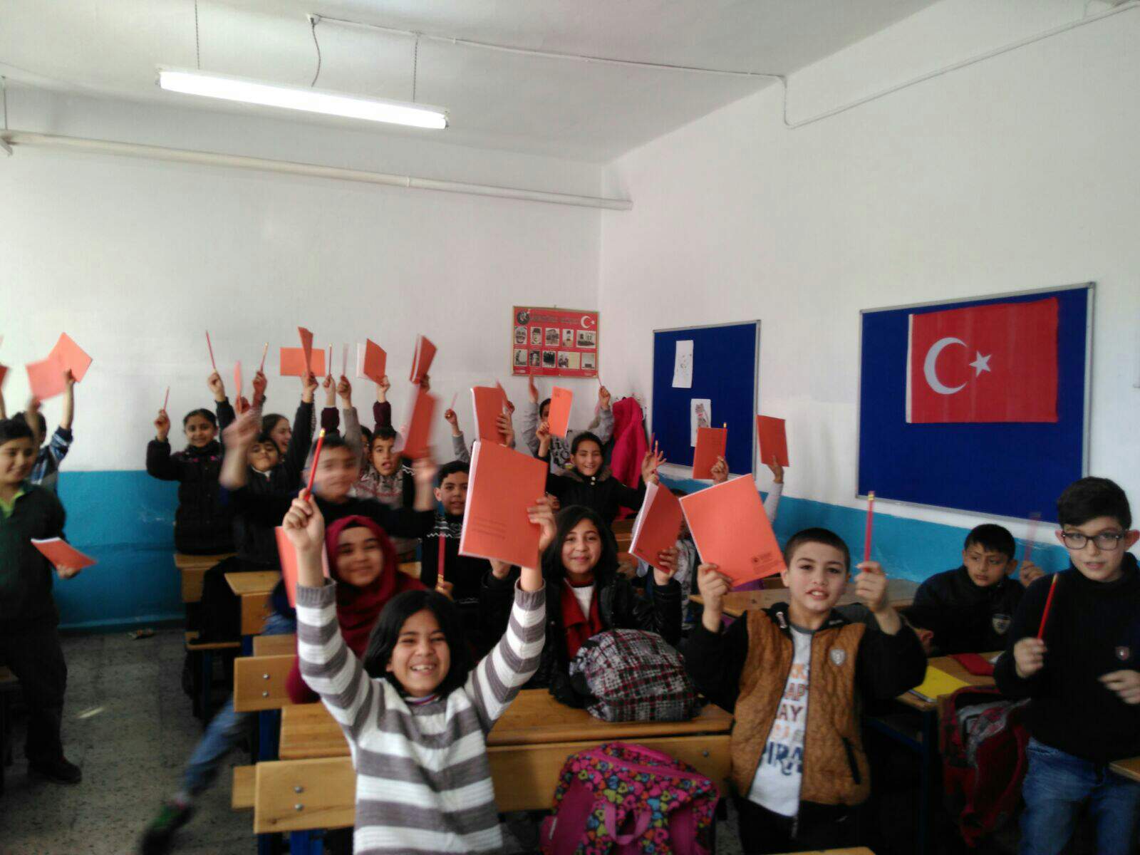 kids in Turkey with new books and pens