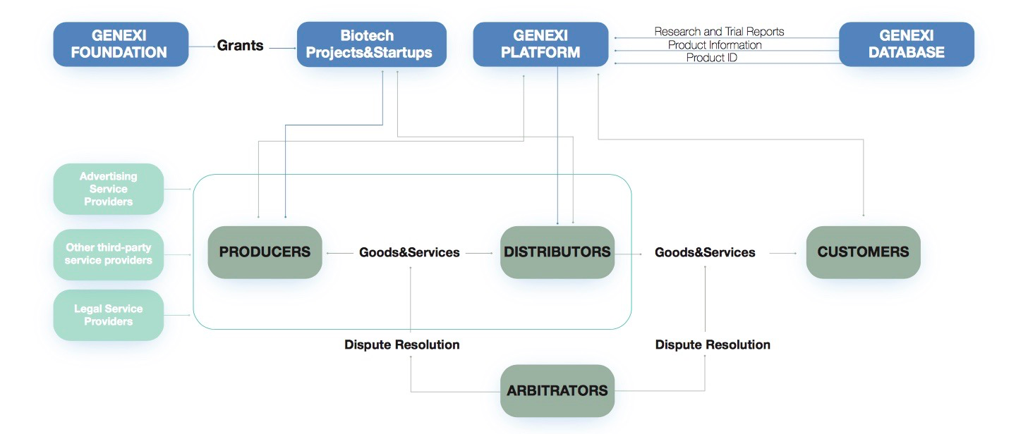GENEXI Platform will provide extra services for promotion and development, giving access to its own expert boards and accommodating third party service providers within the ecosystem. GENEXI Ecosystem will allow a wide range of participants to join the development; aside from the general involvement of every member into the supply chain, GENEXI will provide the marketplace for side services, such as research centers, laboratories and institutes.