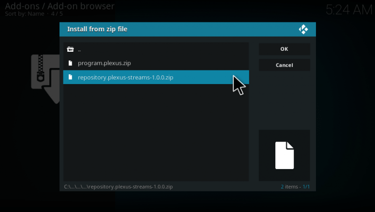 - Go to the downloads folder where your recent downloads are saved. Choose program.plexus.zip and press ok. After the installation of zip file, you will get a notification that the plexus kodi addon is installed.