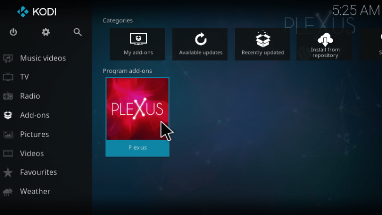 - Now back on to the home screen. Click on addons and go to program addons. You can find the plexus kodi addon installed in your system.