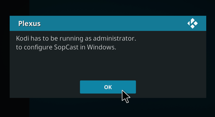 - Once you click on the plexus kodi addon, it will pop-up an window asking kodi to run as administrator to configure SopCast. Just click ok and proceed.