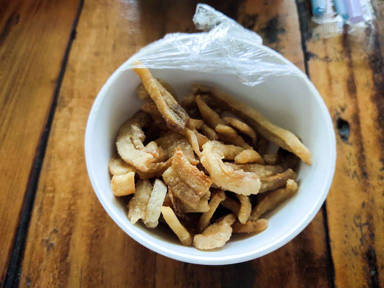- ไขมัน: มีทั้งไขมันดีและไม่ดี ขึ้นอยู่กับปริมาณหนังหมูและน้ำมันที่ใช้