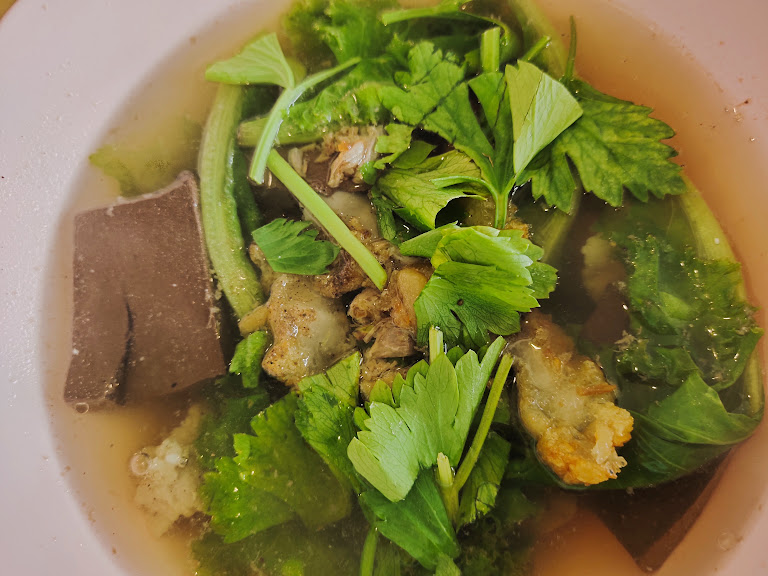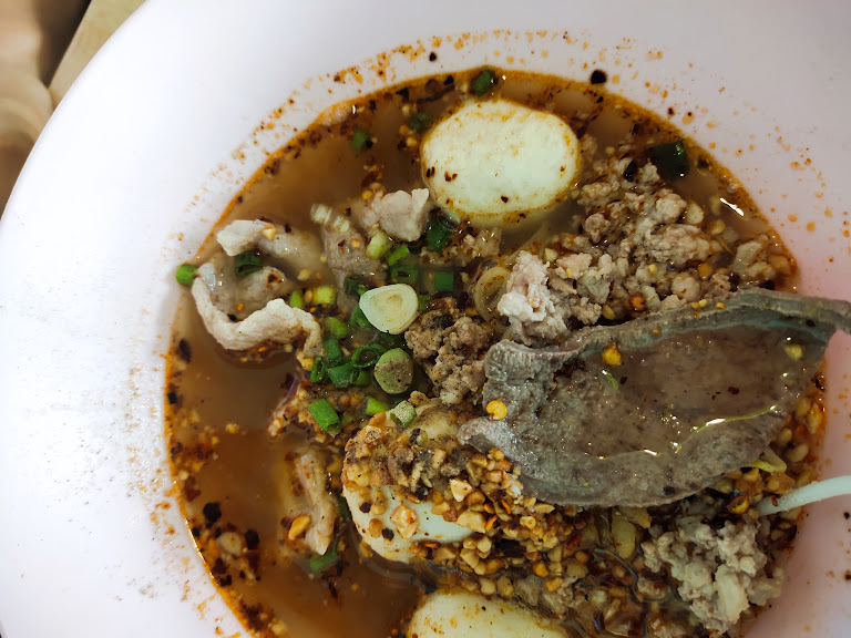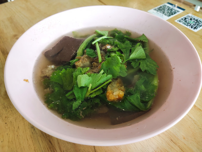 จากนั้นก็ถึงเวลาสำรวจเครื่องเคราในชาม ลืมภาพจำเก่าๆ เกี่ยวกับเลือดหมูไปได้เลยครับ เพราะนี่คือเลือดหมูที่นุ่มเด้งดุจเจลลี่ละลายในปาก และดูดซับรสชาติน้ำซุปไว้เต็มๆ หมูสับก็นุ่มชุ่มฉ่ำ ตับก็สุกกำลังดีไม่มีความขมแม้แต่น้อย ส่วนเครื่องในอื่นๆ ก็มอบเนื้อสัมผัสที่แตกต่างหลากหลาย สร้างความเพลิดเพลินในทุกคำที่เคี้ยว นี่คือชั้นเรียนที่สอนว่าการให้ความเคารพกับวัตถุดิบทุกชิ้นนั้นเป็นอย่างไร