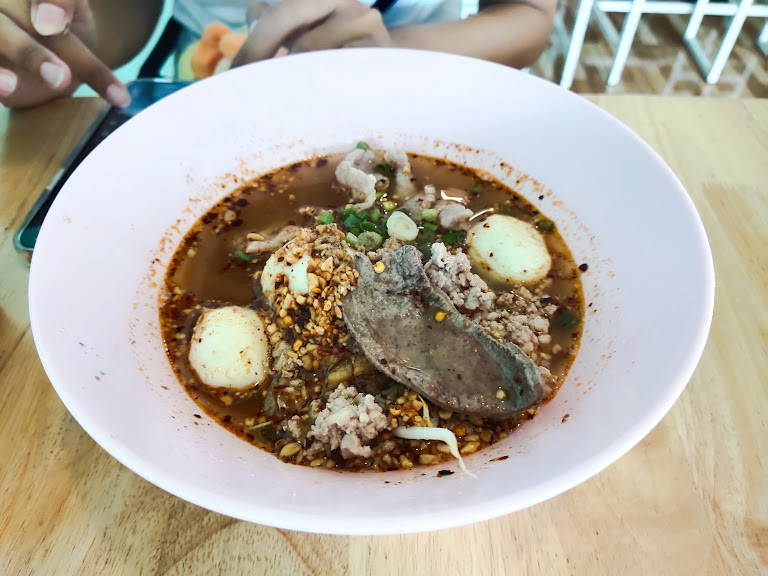 Yes, you read that right. Nestled amongst the fuel pumps and the convenience stores on the outbound road is a humble-looking stall named "Tiew Khae by Je Tu" (เตี๋ยวแคะ by เจ้ตู่). It might not look like much, but what's coming out of that kitchen is pure magic. I'm talking about their Tom Lueat Mu (ต้มเลือดหมู).