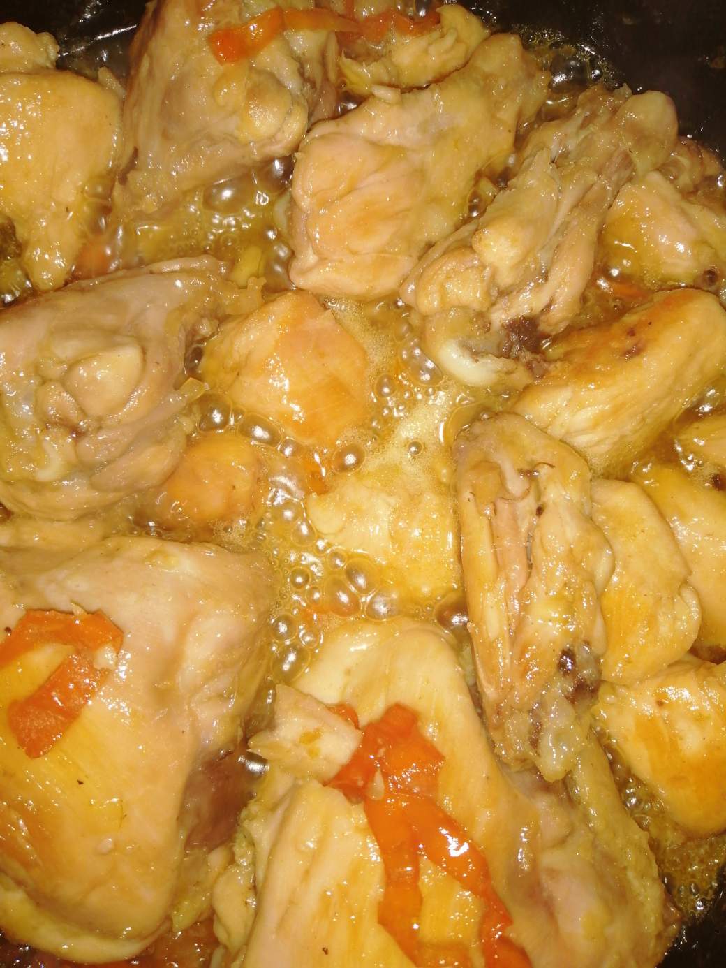 - Le agregamos el azúcar y al ebullir, le colocamos de nuevo el pollo y agua o caldo de pollo, bajamos el fuego y tapamos hasta que evapore.