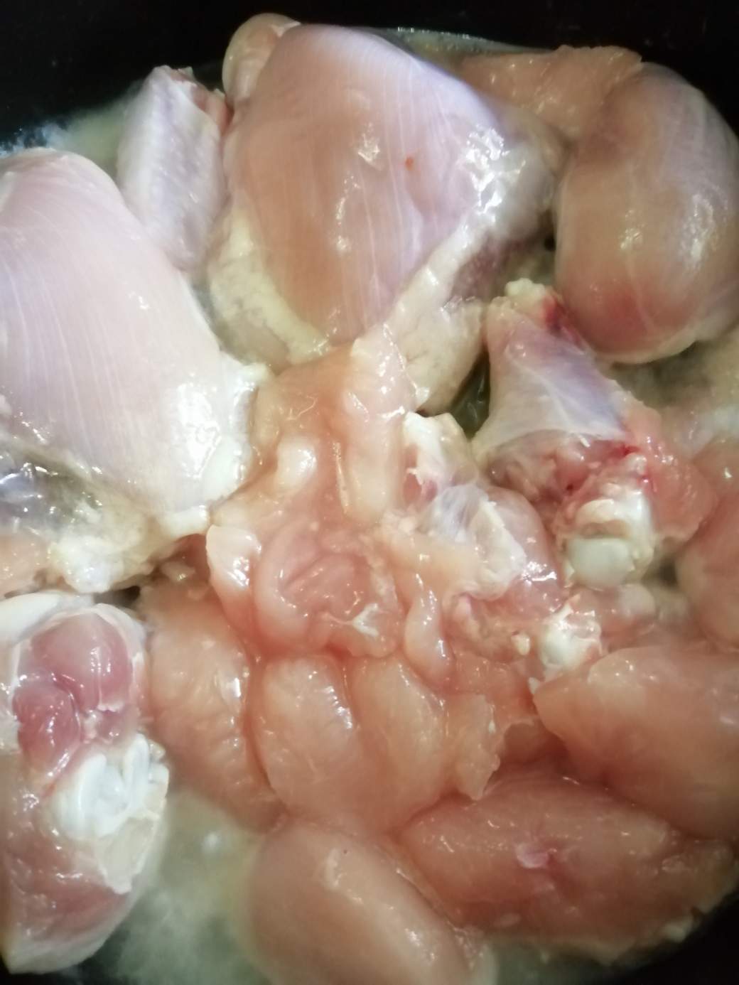 - Picar el pollo en trozos, quitarle la piel y adobar con la sal (no mucha sal, si sufres de hipertensión).