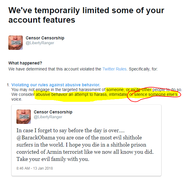 By forcing me to delete a tweet Twitter, has in fact SILENCED my opinion on Barack Obama.