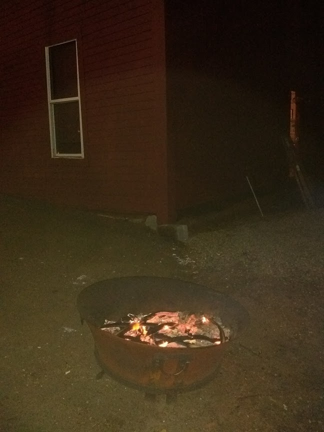 The fire pit with a barn in the background. The camera flash reflects off the smoke from the fire and makes it a bit blurry: