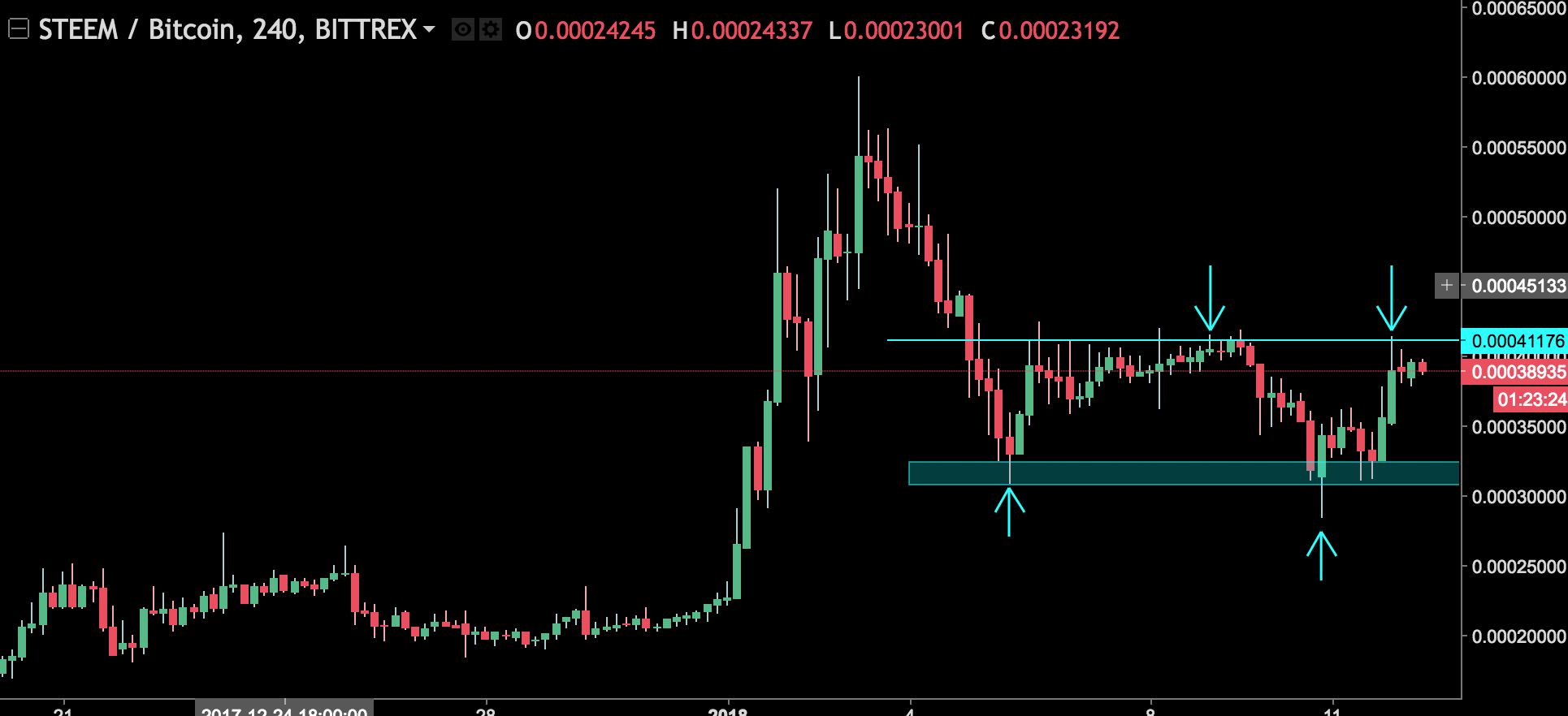 After one heck of a bearish move, we FINALLY see price hit a bottom right above the .0003 level and begin to correct. However, to expect another big rally may be wishful thinking as the crypto market as a whole has seen a decent drop in market capitalization in the new year, especially Ripple and XLM. However, we are starting to see a squeeze at the .0004 structure, creating what seems to be a nice resistance area.