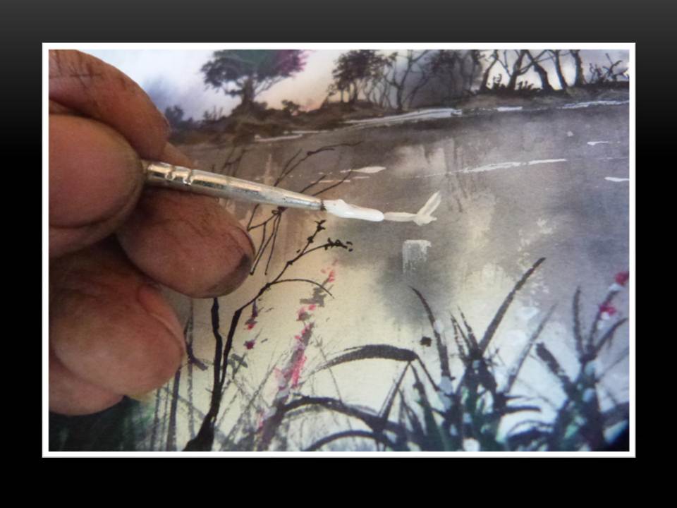- Miren la obra tiene bastantes detalles, por ejemplo, en esta parte logre hacer la vegetación silvestre con muchas líneas curvas trazadas con el pincel de punta fina, aparte de otro arbusto, que dará más vida al paisaje.