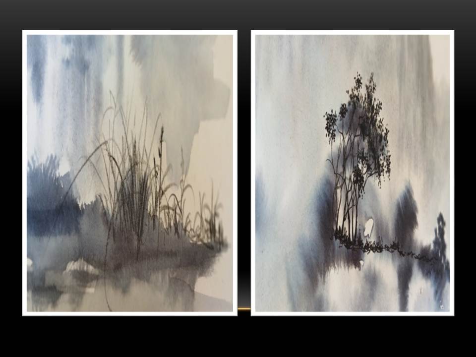 - Observen muy bien, en las diapositivas se presentan solamente manchas, las cuales se expandieron en el soporte gracias a la acción de la tinta china en el pincel y el agua en el soporte FABRIANO.
