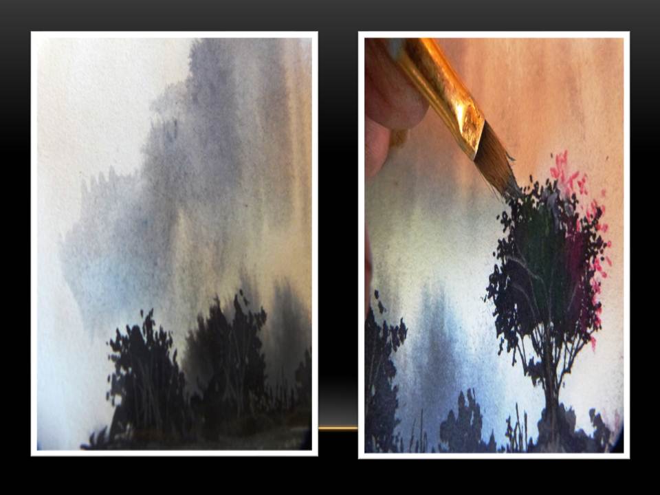 - De las manchas obtenidas, logre colocar manchitas más pequeñitas como puntos realizados con el pincel, para así lograr el efecto de un pequeño arbusto, que se presenta en esta oportunidad con algunas flores de color rosado.