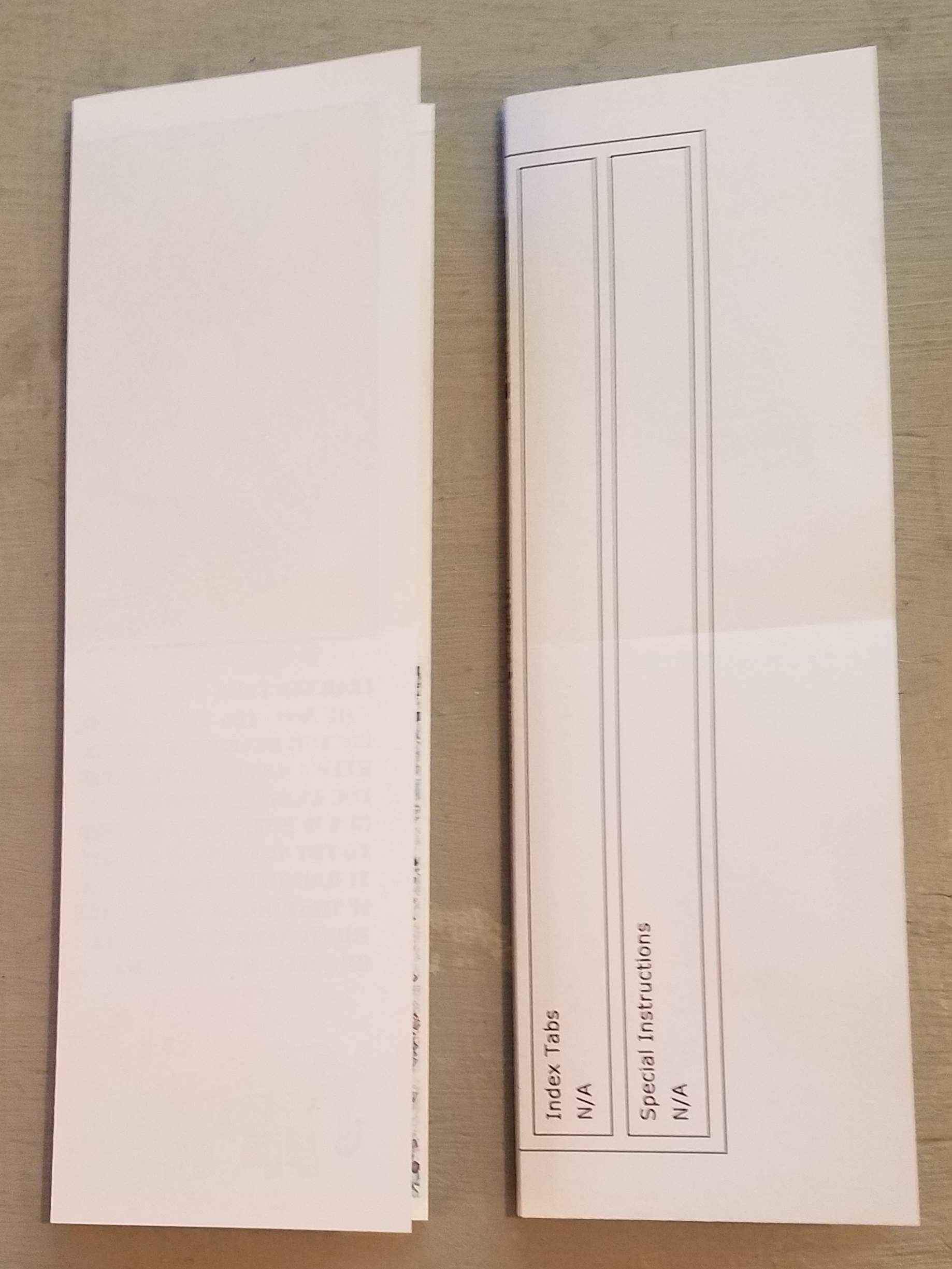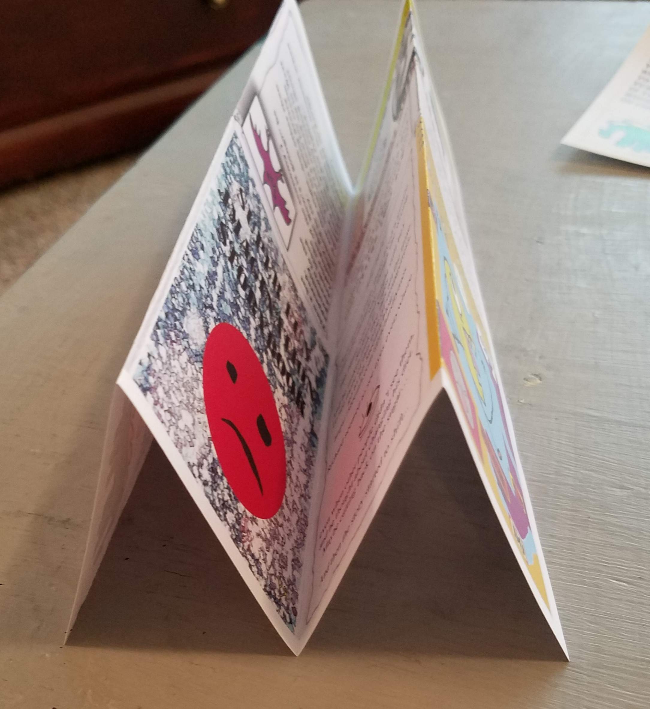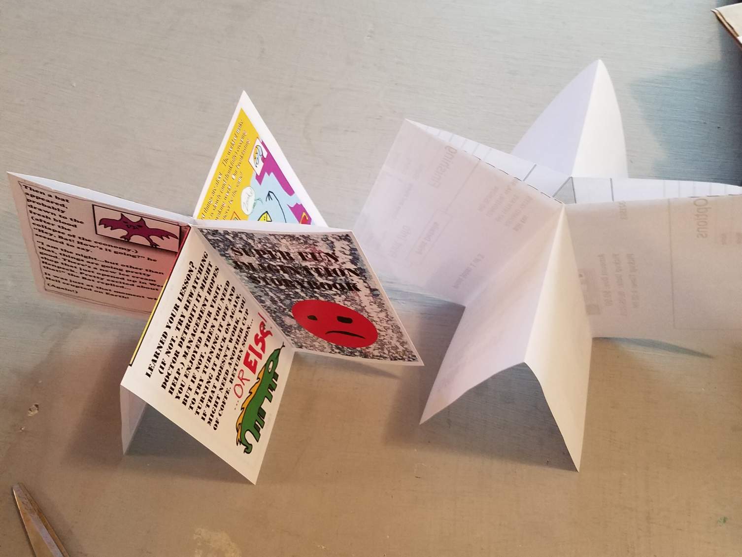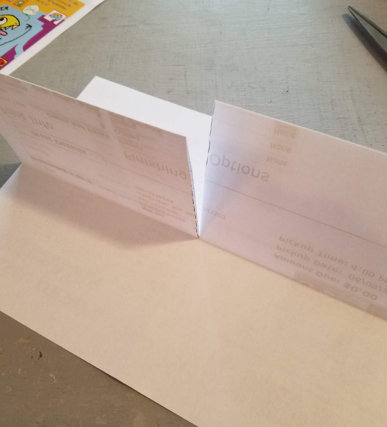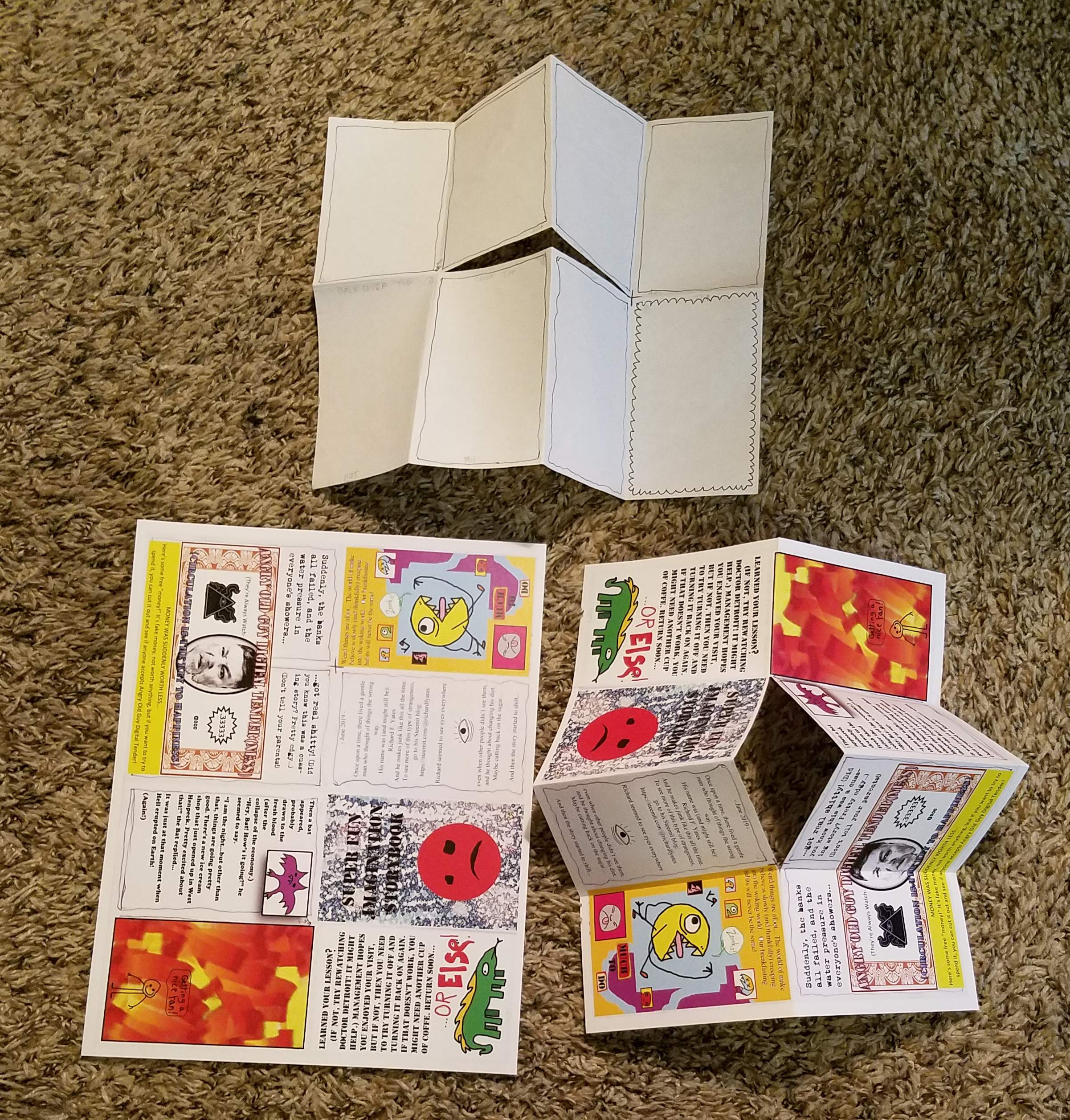Nine. Next, you flatten the "+" until you have two "panels" showing. If you haven't written or drawn anything yet, then it really doesn't matter which spot you pick for this flattening process. The "book" will work no matter which page ends up being "page one." (For my pre-printed zine, I want page one, the front cover, to be on the right and the back cover on the left.)