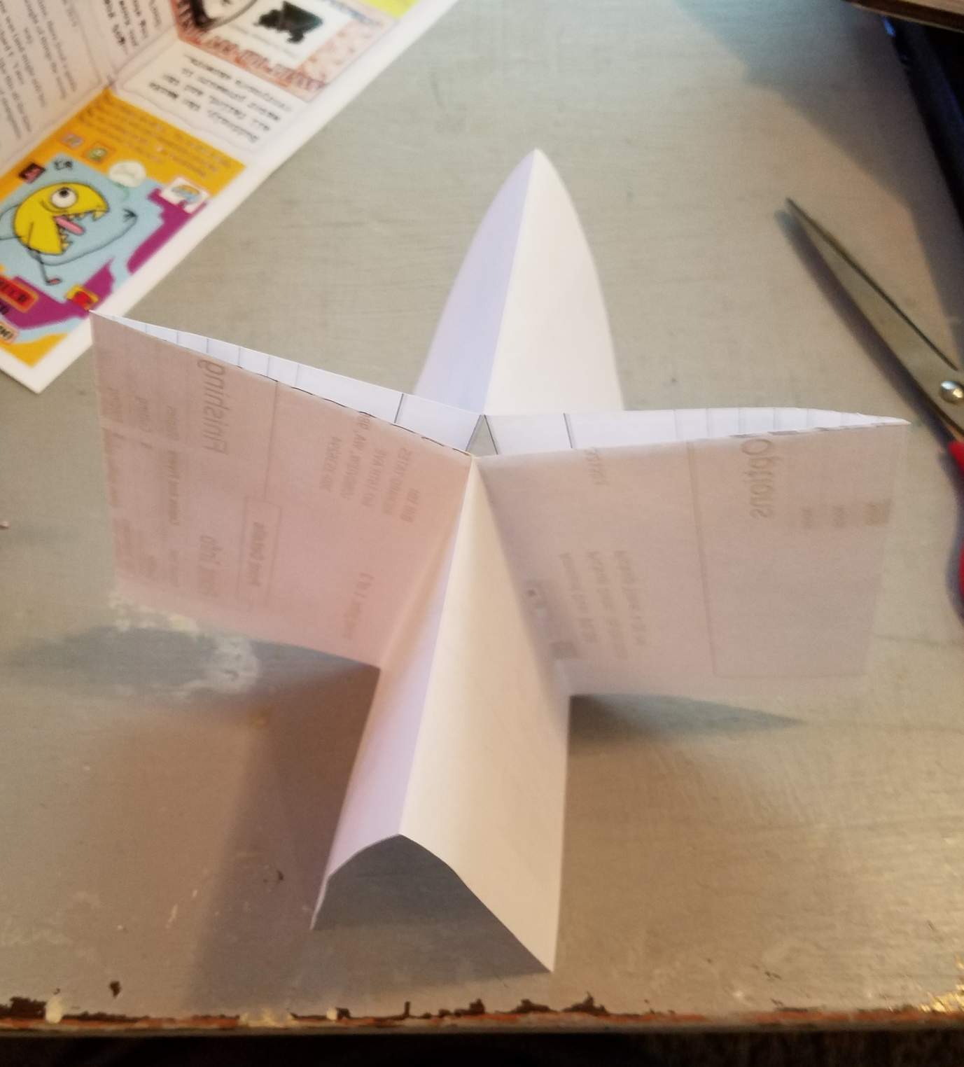Eight. Now here's the fun part. Fold the cut outward, opening the cut like a mouth until you get a "+" shape (or an "x", if you're a superhero fan, I suppose...)