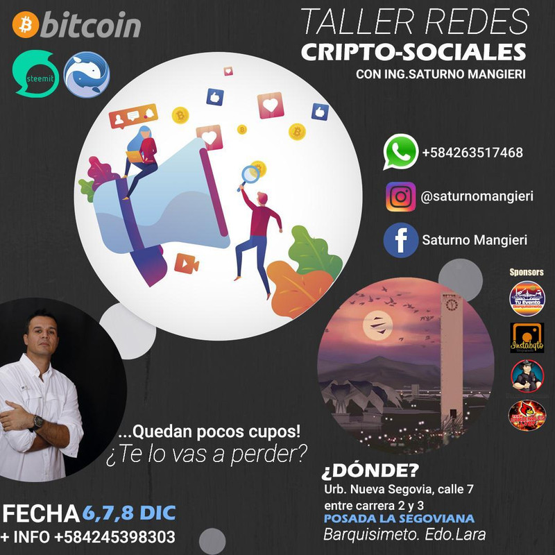 Quiero invitar a toda la audiencia a este primer Taller de Redes Cripto-Sociales. Estaremos formando a las personas en muchos tópicos como: ingresos a las plataformas, comunidades, actividades, mecanismos de manejo de criptomonedas, tácticas y técnicas de escritura tipo Blogging, interacciones básicas y avanzadas, entre otros puntos importantes. Esto tendrá lugar en la Posada La Segoviana de Barquisimeto, Venezuela....Ya puedes continuar.