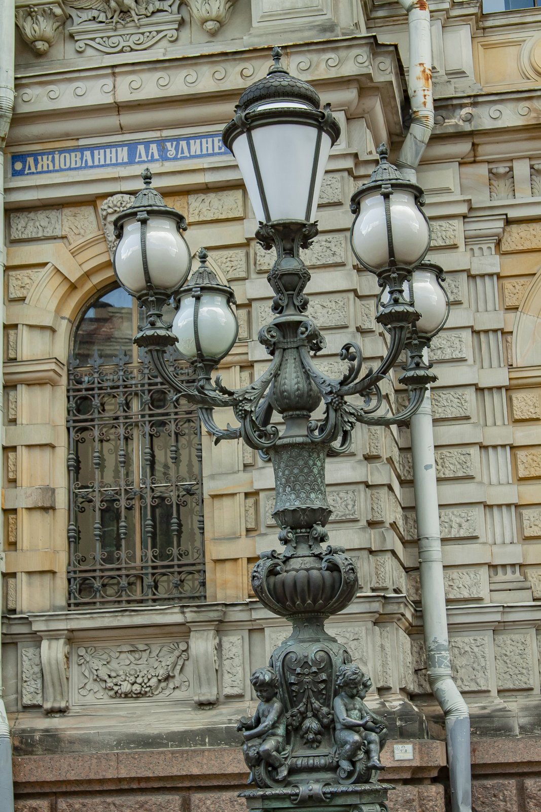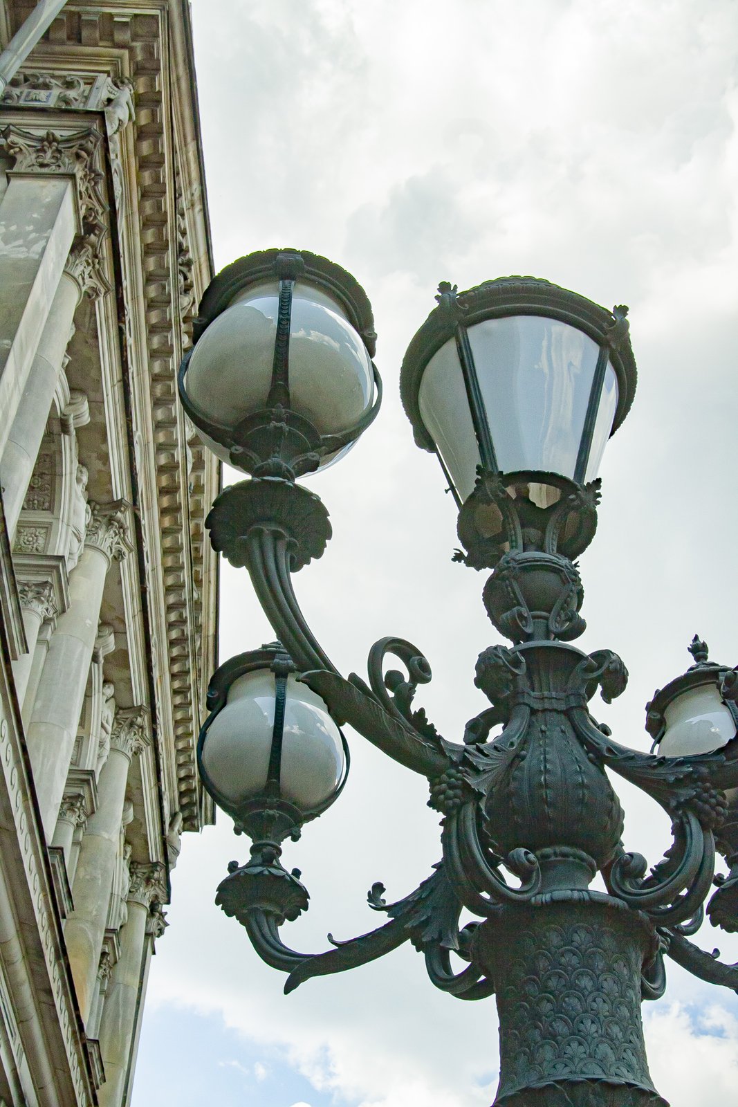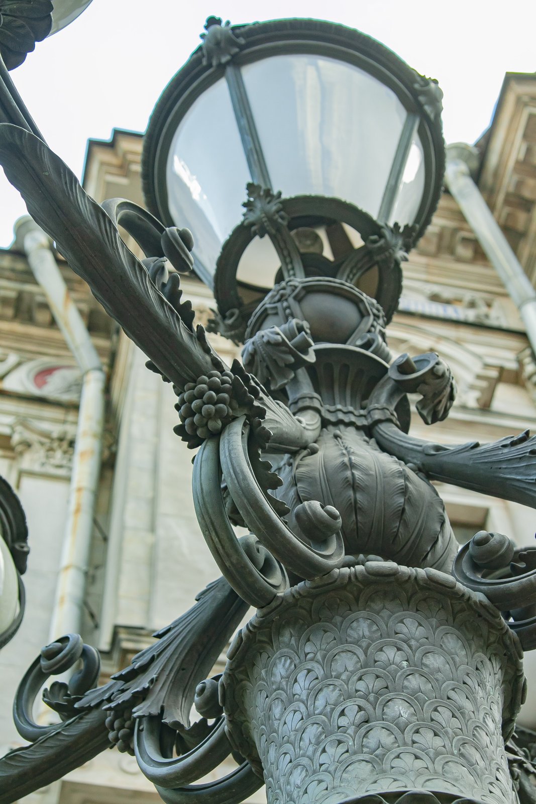 Каждый фонарь выполнен из металла и представляет собой настоящее произведение искусства. Я постарался заснять их со всех сторон, не забывая и о самом здании. Если говорить о его аржитектуре, то она представляет из себя своеобразный истоический стиль. Это самая настоящая эклектика, где собраны стили разных времён и эпох.