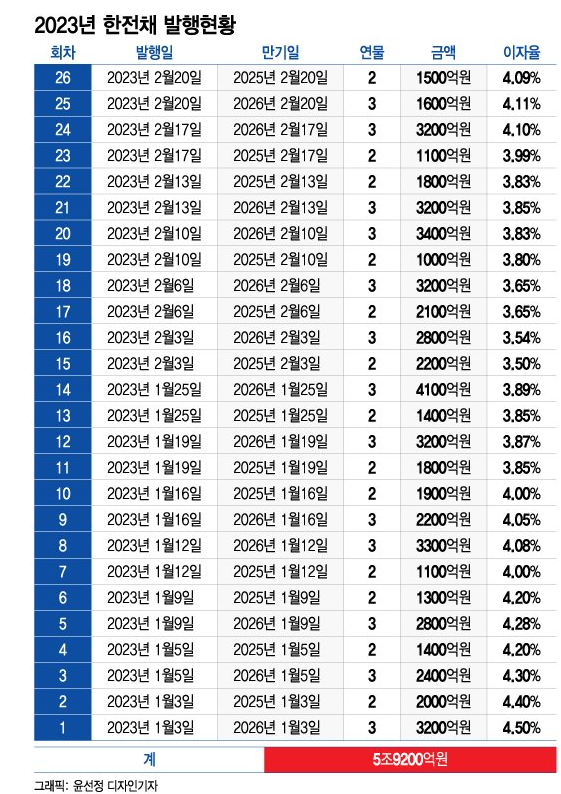 단기물 위주에 지난해보다 높은 이자율 등 악조건 속에서도 한전채 발행이 늘어나면서 채권 시장 수급불균형과 한전의 이자 비용 부담 역시 커질 전망이다.