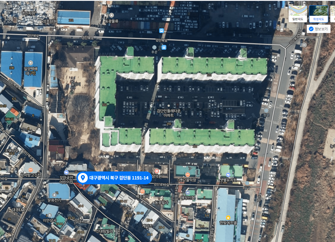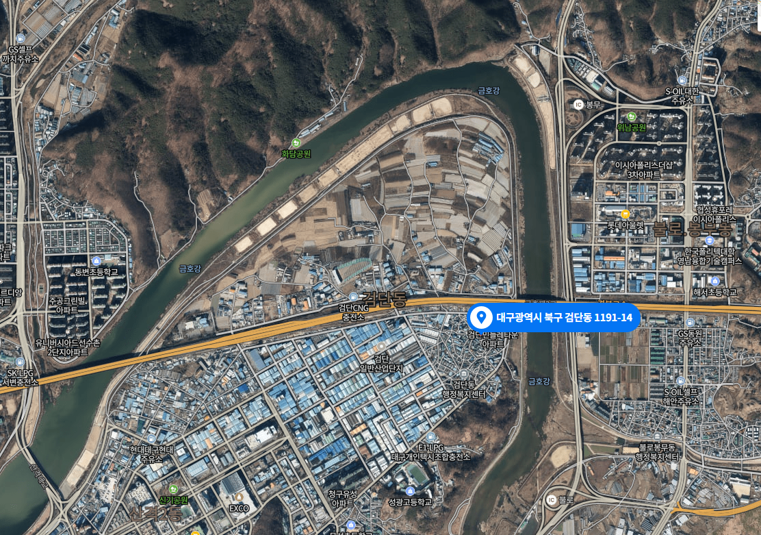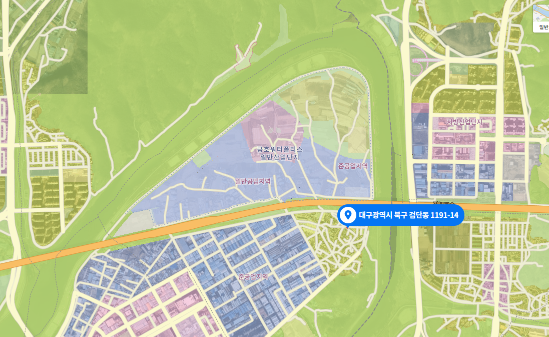 이 땅 자체로는 아무것도 할 수 없습니다. 35제곱미터의 1/4를 낙찰받아 상대방 지분권자에게 나머지 3/4를 마저 인수하거나, 내 지분을 팔아야 하는데 쉬울 것 같지는 않습니다. 총 35제곱미터를 모두 차지하더라도 골목 구석이라 떡볶이 포장마차도 차릴수도 없을 것 같습니다. 바로 근처에 금호워터폴리스라고, 대구시와 수자원공사가 함께 추진하는 대형 프로젝트가 있지만 고속도로로 가로막혀 있어 직접적인 영향권은 아닙니다.