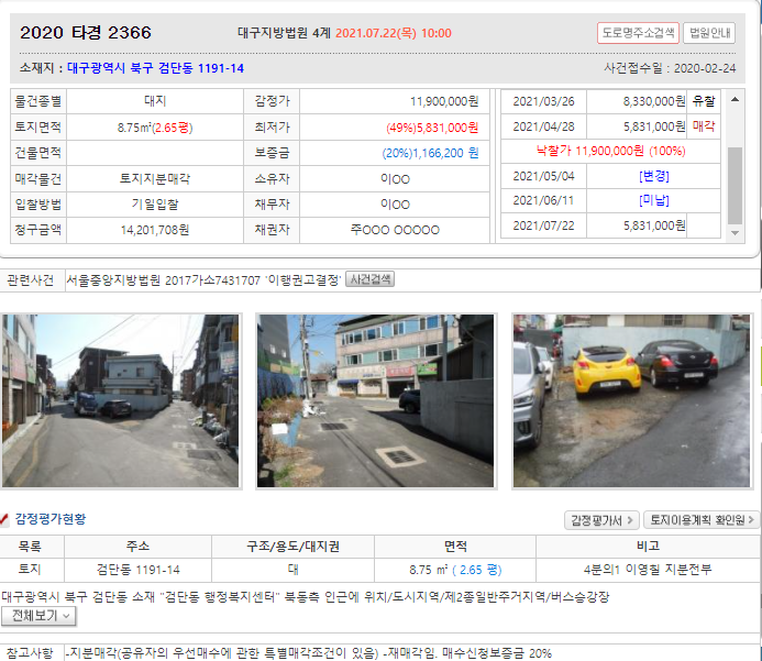 경매 사이트에 가입해서 눈팅중입니다. 대구 검단동에 2.65평짜리(8.75제곱미터) 땅이 경매로 나왔네요. 2.65평이 오롯이 내 땅이 되는 것이 아니라 35제곱미터짜리 땅에서 1/4의 지분을 소유하는 개념입니다. 오늘 입찰이라는데 경매결과가 궁금하네요.