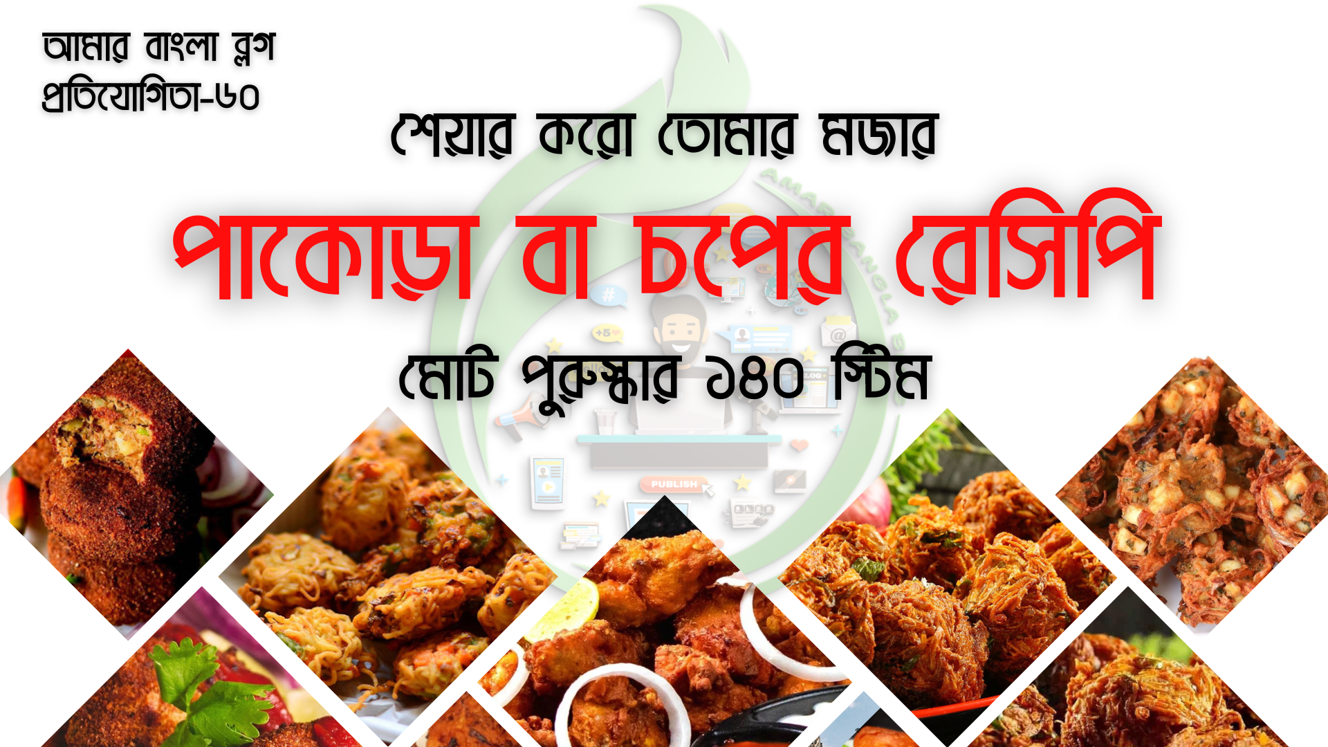 প্রায় একমাস পর আবার চলে এলাম আমার বাংলা ব্লগ এর একটি প্রতিযোগিতা নিয়ে।বাংলাদেশে ইন্টারনেটের প্রবলেম হওয়ার কারণে প্রতিযোগিতাটি একটু পিছিয়ে যায়।ইউজারদের ছাড়া একেবারে শূন্য হয়ে পড়ে রয়েছিল আমাদের প্রিয় কমিউনিটি। যাইহোক এখন আবার ভরপুর হয়ে উঠেছে, যা দেখে খুবই ভালো লাগছে। তাই ঠিক এই আনন্দে "আমার বাংলা ব্লগ" তার ৬০ তম প্রতিযোগিতা নিয়ে হাজির হয়ে গিয়েছে।ব্যানার দেখেই সকলেই বুঝে গিয়েছেন আজকের বিষয়বস্তু। হ্যাঁ বন্ধুরা, আজকে এমন একটি বিষয় নিয়ে হাজির হয়েছি যার নাম শুনলে সকলের মুখেই পানি চলে আসবে।ছেলে, বুড়ো সকলেরই খুবই পছন্দের একটি খাবার। আমার বাংলা ব্লগ -এর ৬০ তম প্রতিযোগিতার বিষয় বস্তু হচ্ছে শেয়ার করো তোমার মজার পাকোড়া বা চপের রেসিপি