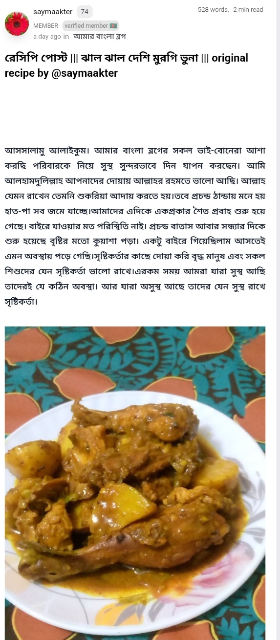 রেসিপি পোস্ট ঝাল ঝাল দেশি মুরগি ভুনা original recipe by @saymaakter (29/12/2025)