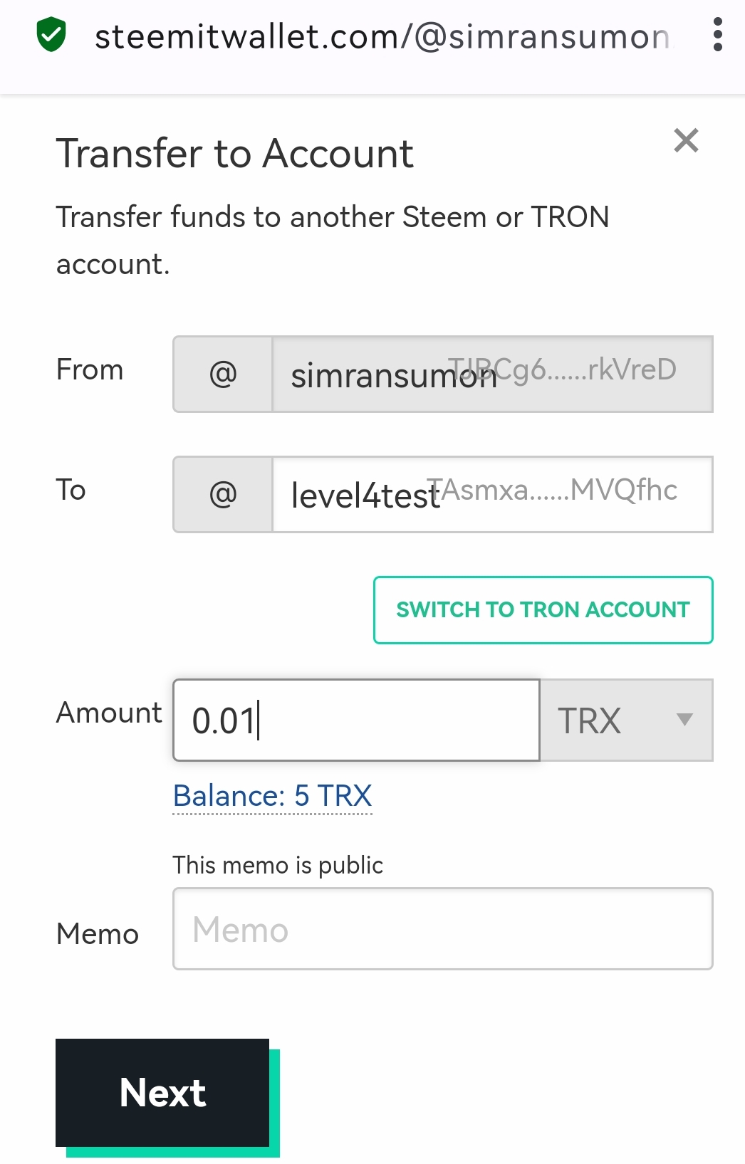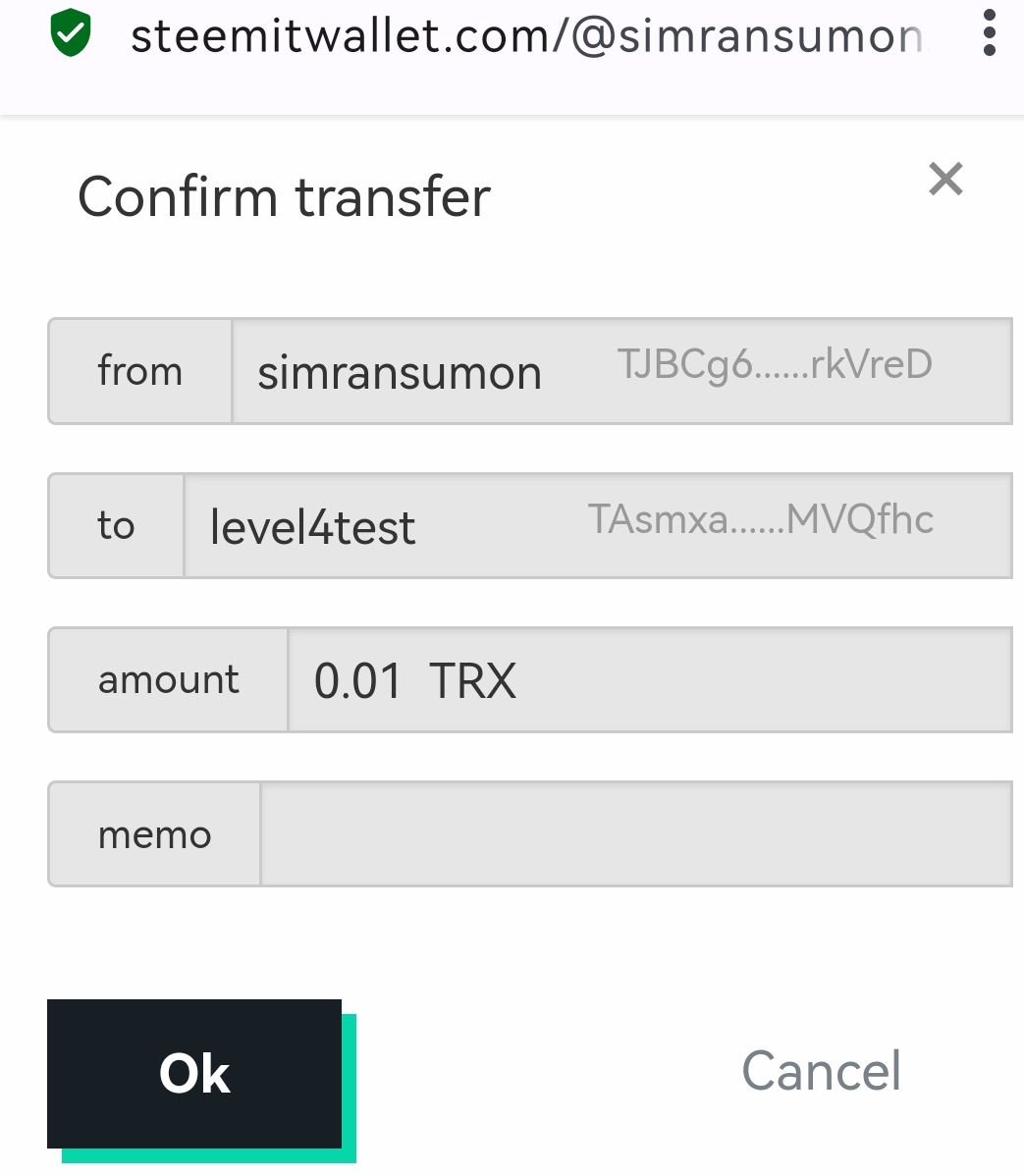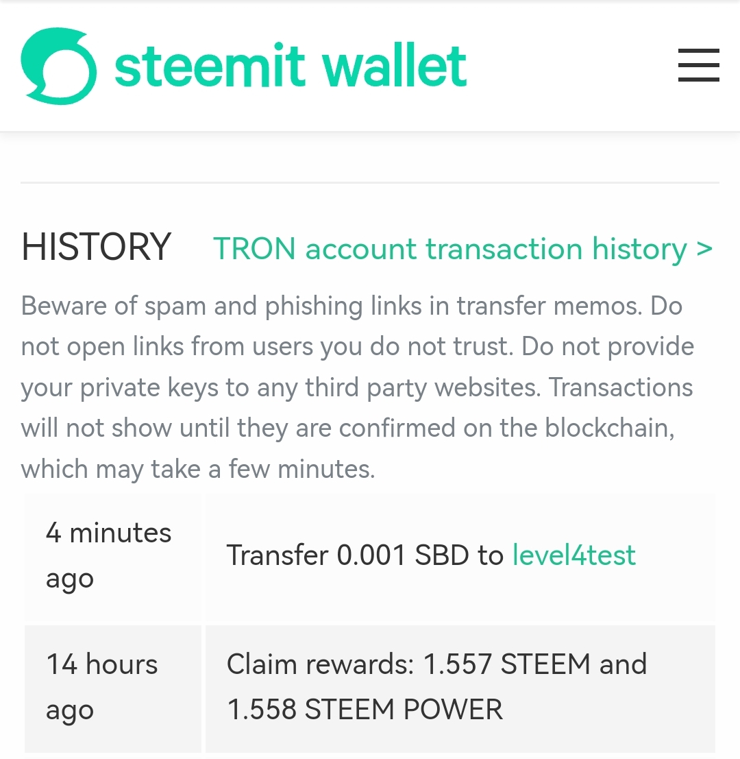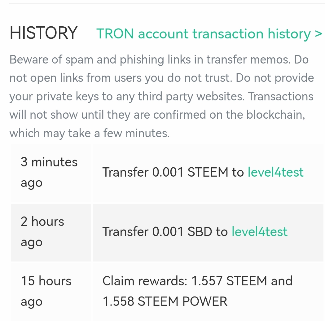 ৪। প্রশ্ন: P2P এর মাধ্যমে আপনার Steemit অ্যাকাউন্ট হতে @level4test অ্যাকাউন্ট এ 0.01 TRX সেন্ড করুন এবং এটার স্ক্রিনশট শেয়ার করুন।