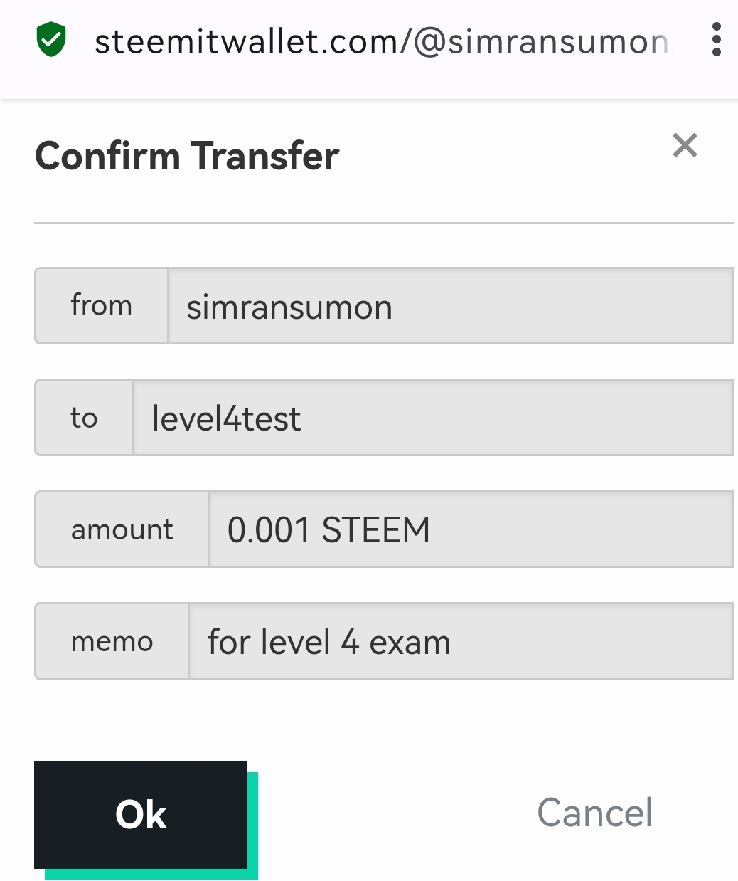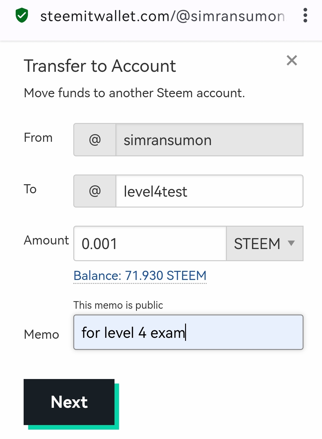 ৩। প্রশ্ন: P2P এর মাধ্যমে আপনার Steemit অ্যাকাউন্ট হতে @level4test অ্যাকাউন্ট এ 0.001 Steem সেন্ড করুন এবং এটার স্ক্রিনশট শেয়ার করুন।