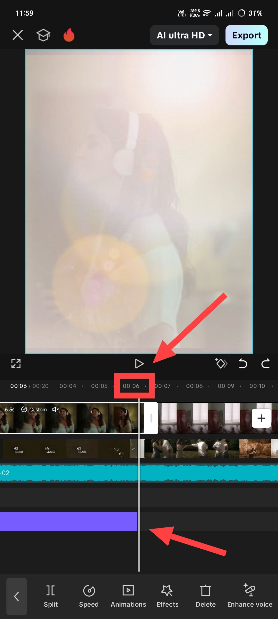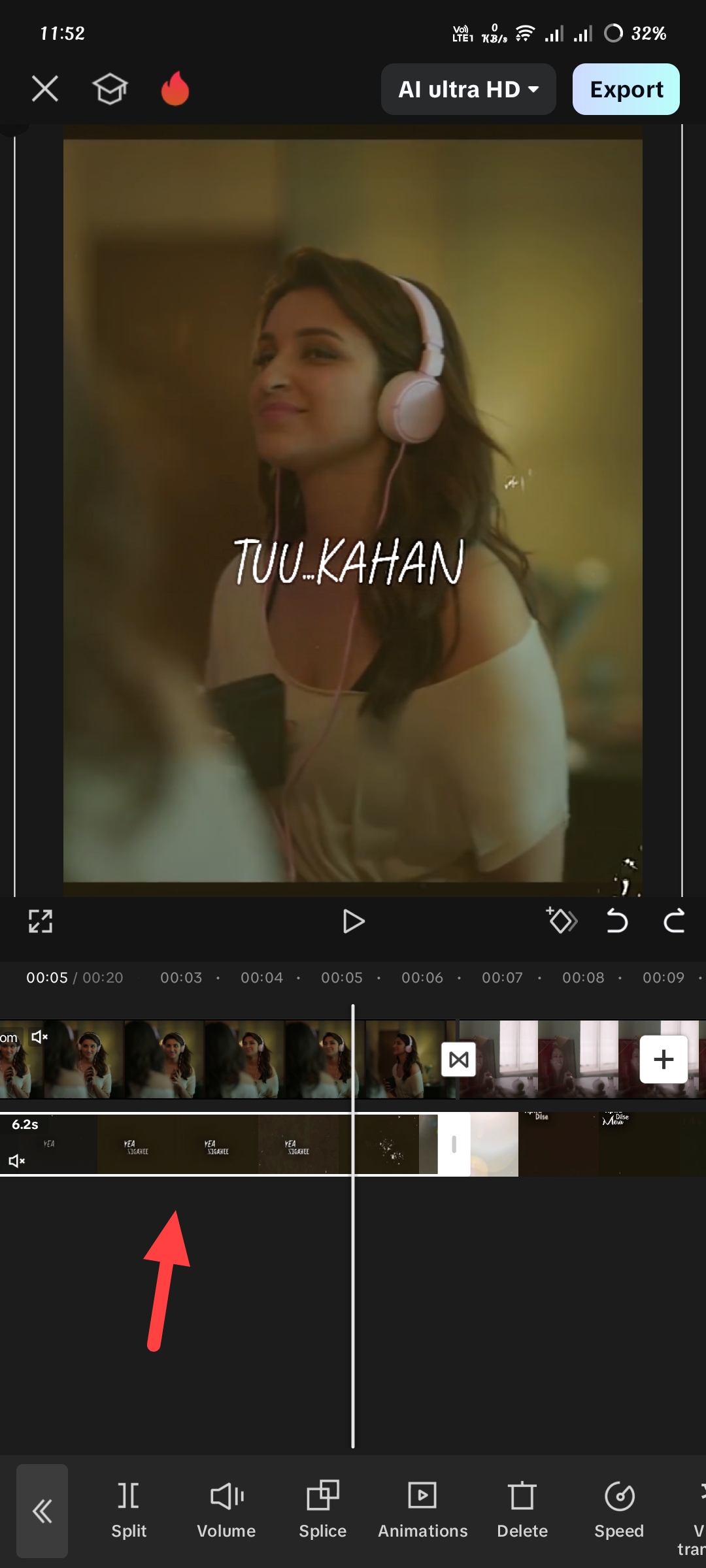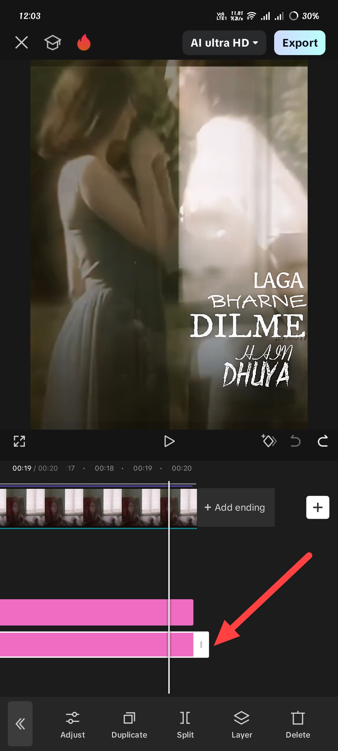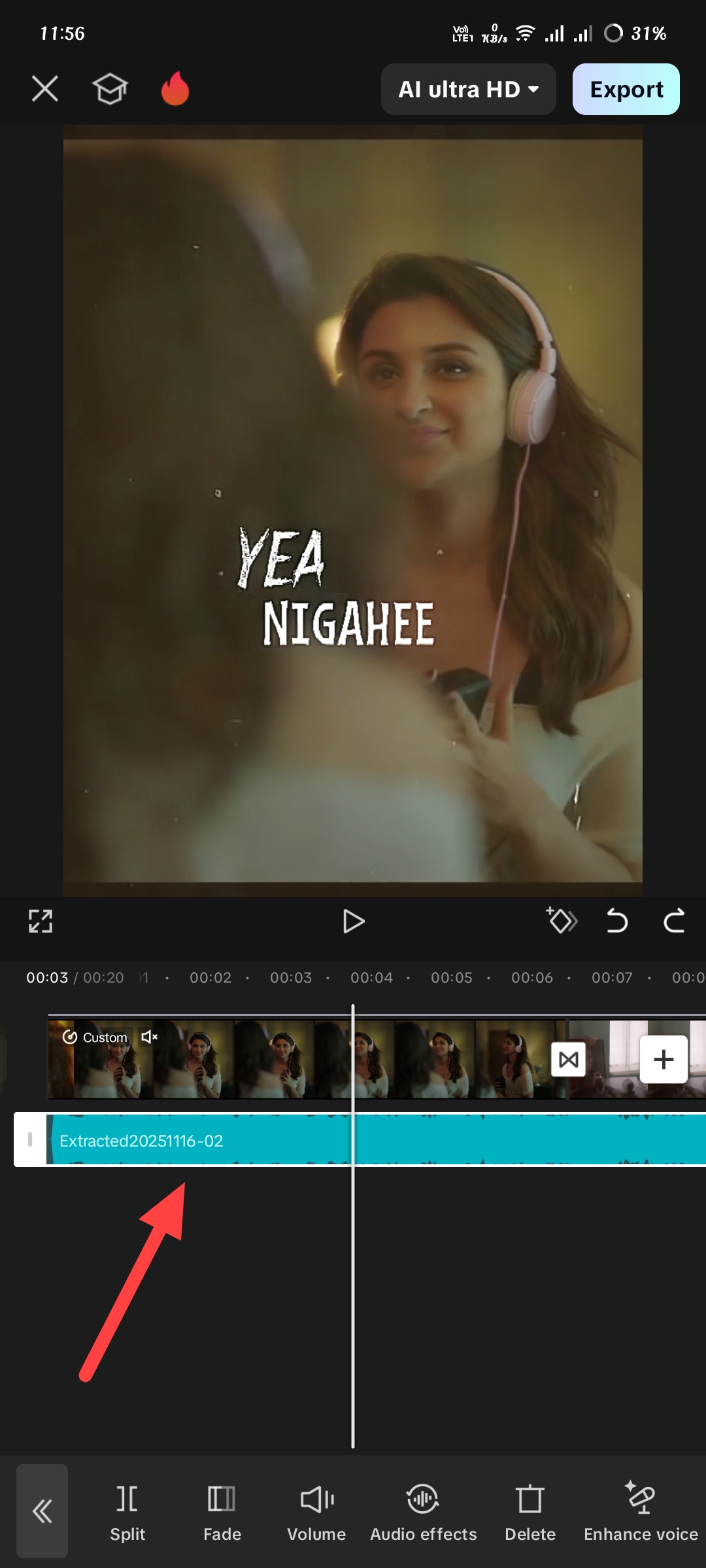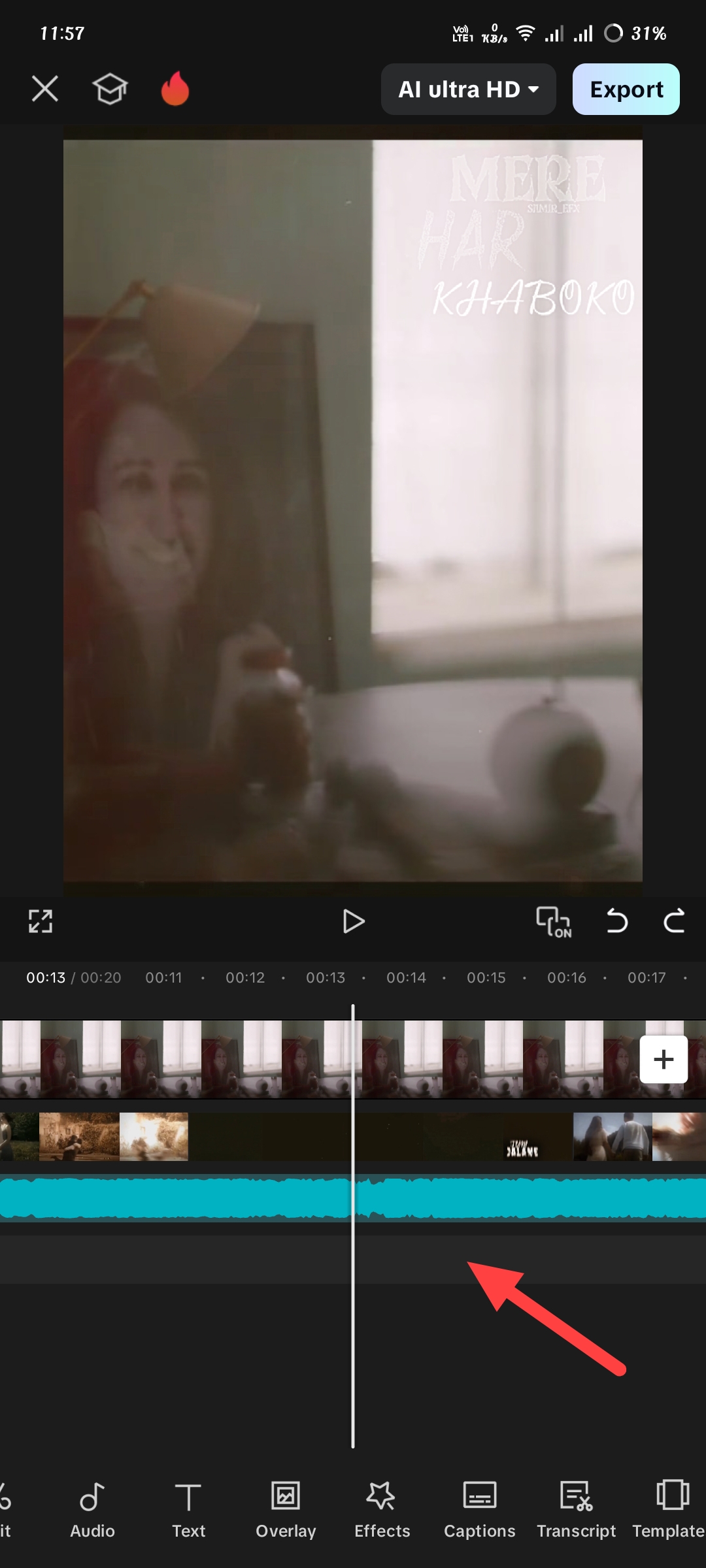 এর পরবর্তীতে একটা ছবি ব্যবহার করেছি যেটাকে ৬.৫ সেকেন্ডের পর থেকে শুরু করে ২০.৩ সেকেন্ড পর্যন্ত নিয়েছি । এরপর Overlay অপশনে গানের লিরিক্স ব্যবহার করেছি আর এইটা ইউটিউব থেকে ডাউনলোড করে ব্যবহার করেছি, এখানে যে গানটা ব্যবহার করেছি সেটা হলো অরিজিৎ সিং এর Tere Bina.