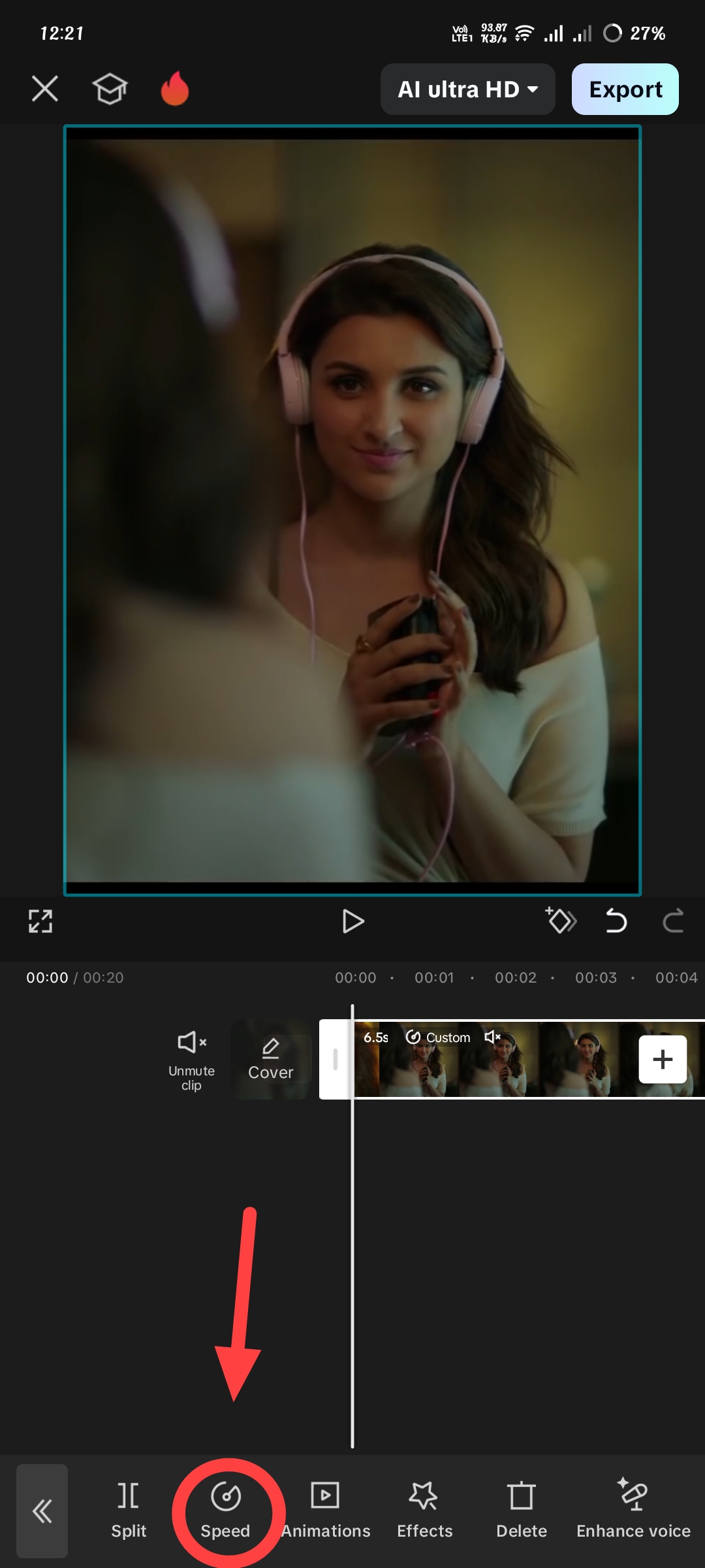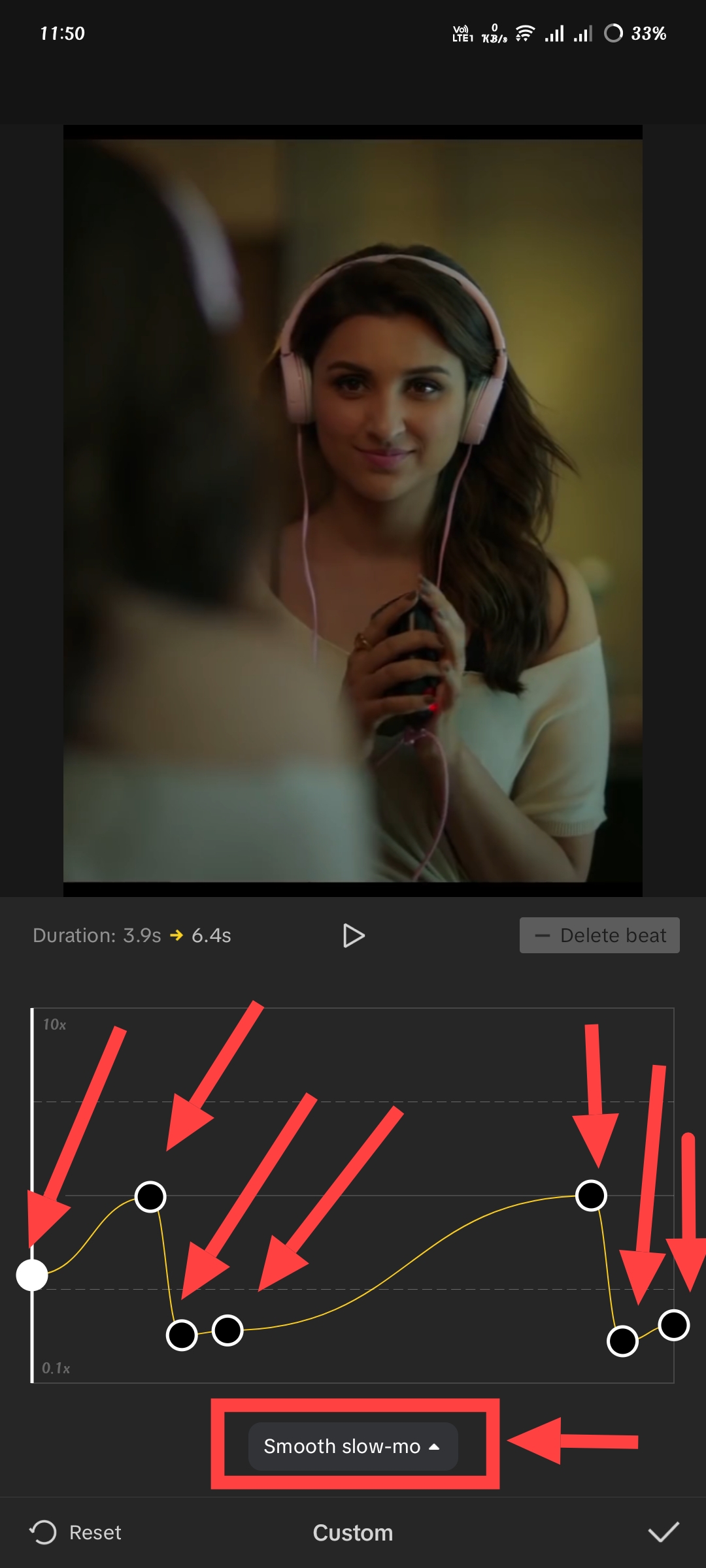 আমি প্রথমে একটা ভিডিও ক্লিপ নিয়েছি সেখানে সাবজেক্ট পরিনীতি চোপড়া রয়েছে, আপনারা চাইলে যেকোনো ধরনের সাবজেক্ট বসাতে পারেন । ভিডিও ক্লিপটা ৩.৯ সেকেন্ডের আর এখানে আমি স্লো মোশন ব্যবহার করেছি এতে করে ভিডিওটাও সুন্দর হবে আর আমার ব্যবহার করা গানের লাইনগুলো মিলে যাবে । স্লো মোশন করার জন্য ভিডিও ক্লিপে ক্লিক করে Speed অপশনে ক্লিক করতে হবে এবং Curve অপশনে গিয়ে ক্লিপটাতে যেভাবে পয়েন্ট গুলো ব্যবহার করেছি সেই ভাবে করে ক্লিপটাকে ৬.৫ সেকেন্ডের করতে হবে ।