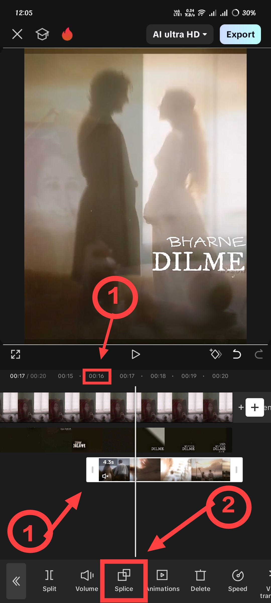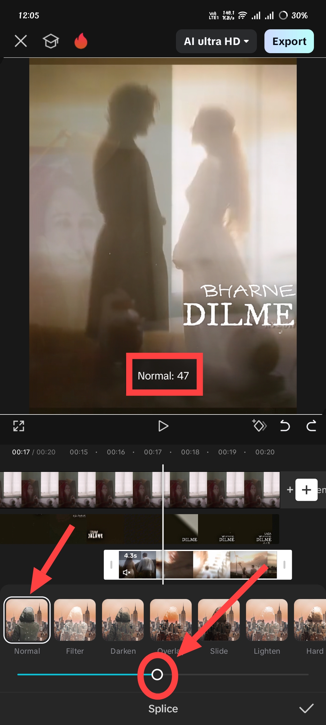 এর পরবর্তীতে আমি আবার ১৬ সেকেন্ড এ গিয়ে আরেকটা Overlay ব্যবহার করেছি এবং এই ক্লিপটা ছিলো আগের Overlay এর বাকি অংশ । এই ক্লিপটা আমি ১৬-২০.৩ সেকেন্ড পর্যন্ত ব্যবহার করেছি অর্থাৎ ভিডিও এর শেষ পর্যন্ত । এরপর ভিডিওতে ক্লিক করে Splice অপশনে গিয়ে নরমাল Splice টাকে ৪৭ করে দিয়েছি ।