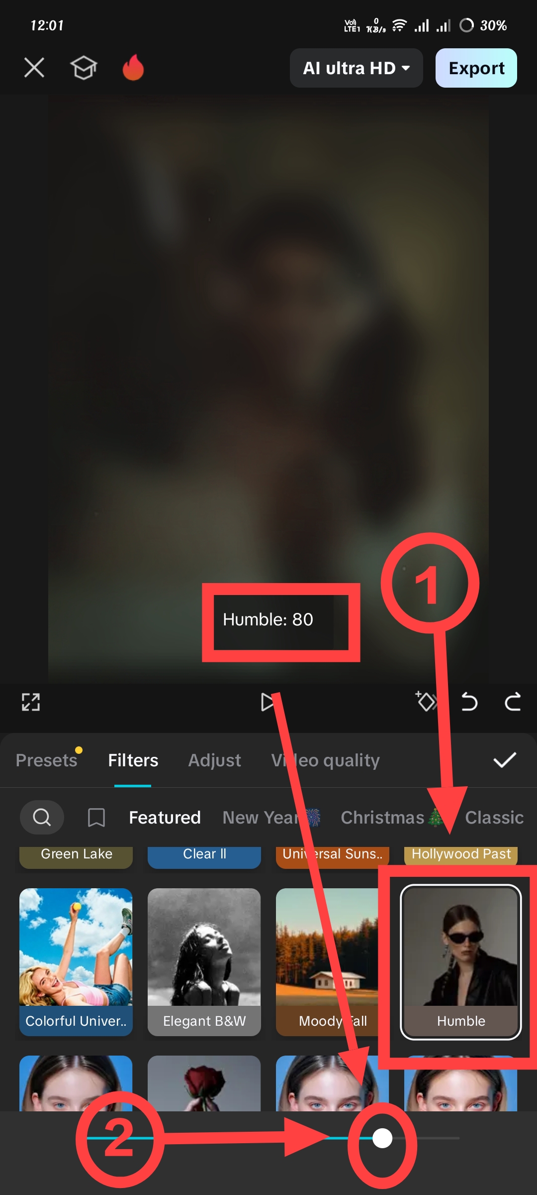 এরপর Adjust এর মধ্যে ক্লিক করে Filters-এ গিয়ে একটু স্ক্রল করে নিচে Humble-এ ক্লিক করে ৮০ পর্যন্ত করে দিয়েছি । এরপর এটাকে ভিডিও এর শুরু থেকে শেষ পর্যন্ত সেট করে ফেলেছি অর্থাৎ (০.০-২০.৩) ।