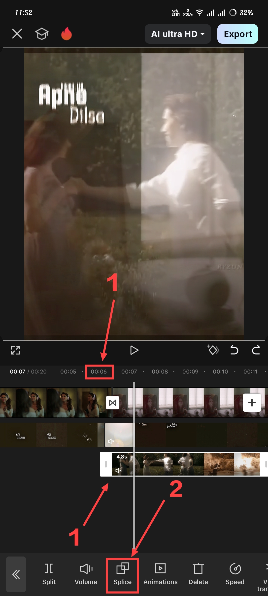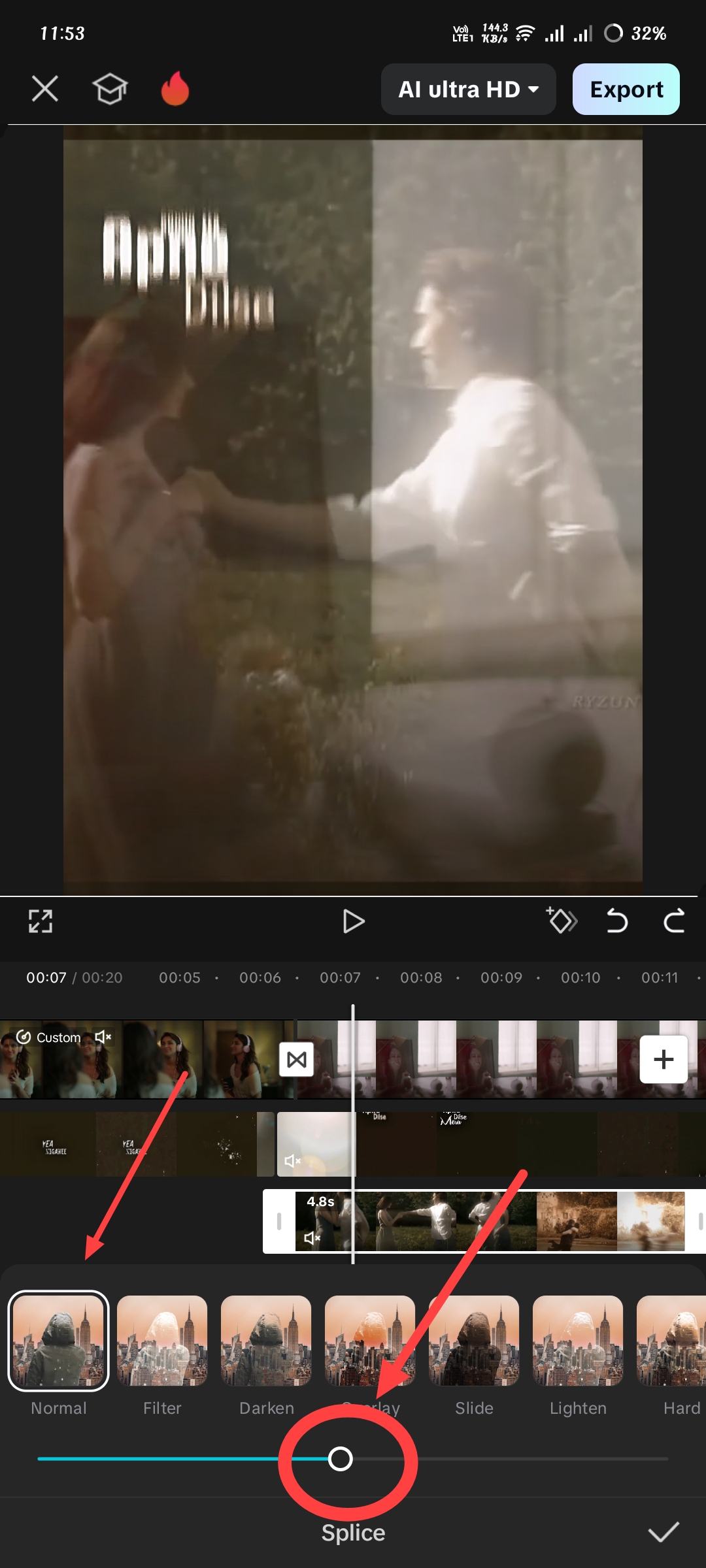 এরপর আমি প্রথমে যে ভিডিও ক্লিপ টা রেখেছিলাম সেটা শেষ হওয়ার পর যখন আরেকটা ক্লিপ শুরু হয় সেখান থেকে (৬.৫-১১.৩ সেকেন্ড) আরেকটা Overlay ব্যবহার করেছি । এই Overlay এর মধ্যে ছিলো স্মৃতিচারণ আর আমি এখানে রেন্ডম কাপলের কিছু সুন্দর মুহূর্তের ভিডিও ক্লিপ ব্যবহার করেছি । এরপর সুন্দর মুহূর্তের ভিডিও ক্লিপের মধ্যে ক্লিক করে Splice অপশনে গিয়ে নরমাল Splice টাকে ৫০ করে দিয়েছি । এখানে Splice এর ব্যবহারটা আমি আপনাদের বুঝিয়ে বলছি, Splice ব্যবহার করার মাধ্যমে এখানে Overlay এর ক্লিপটার ভিজিবিলিটি কমিয়ে দেওয়া হয়েছে যাতে করে পিছনে থাকা ছবিটাও হালকা দেখা যায় ।