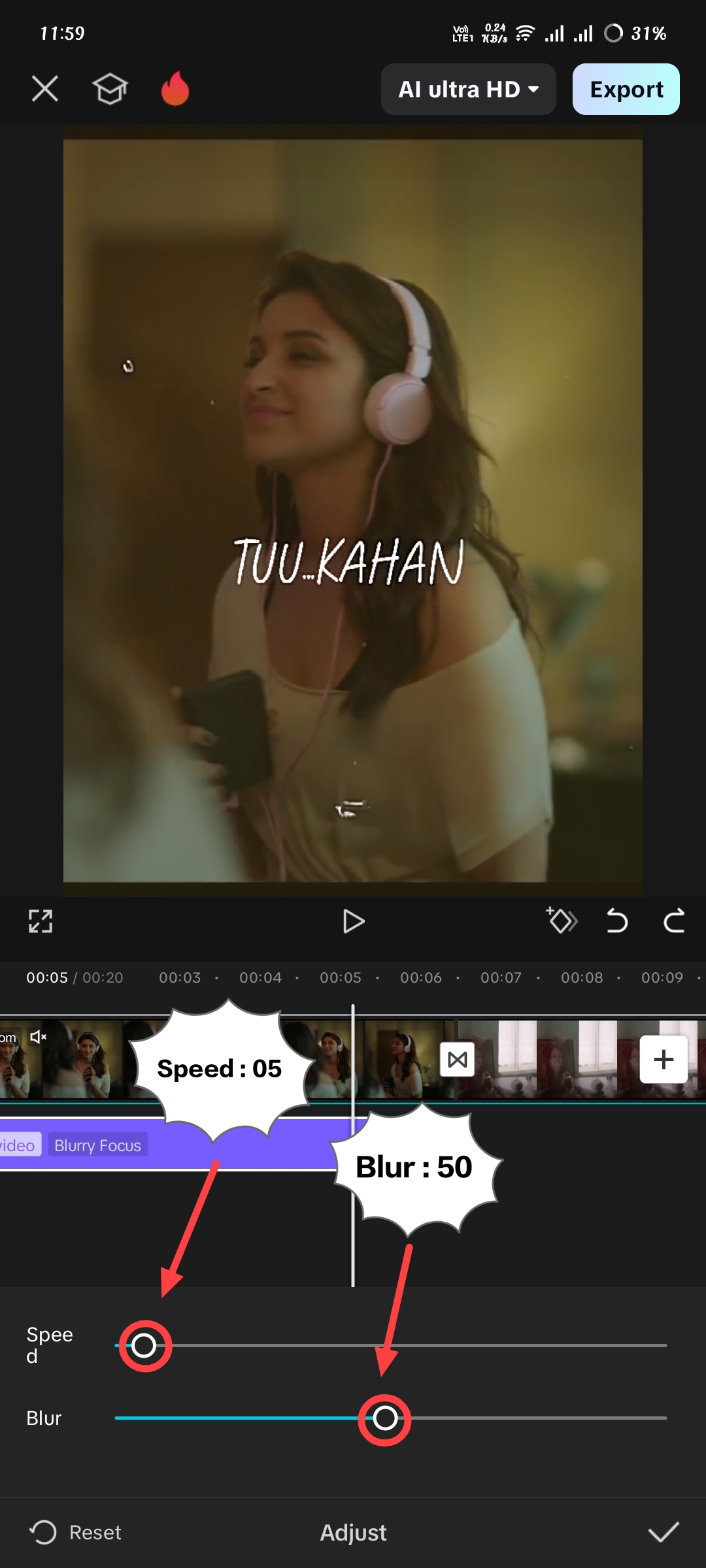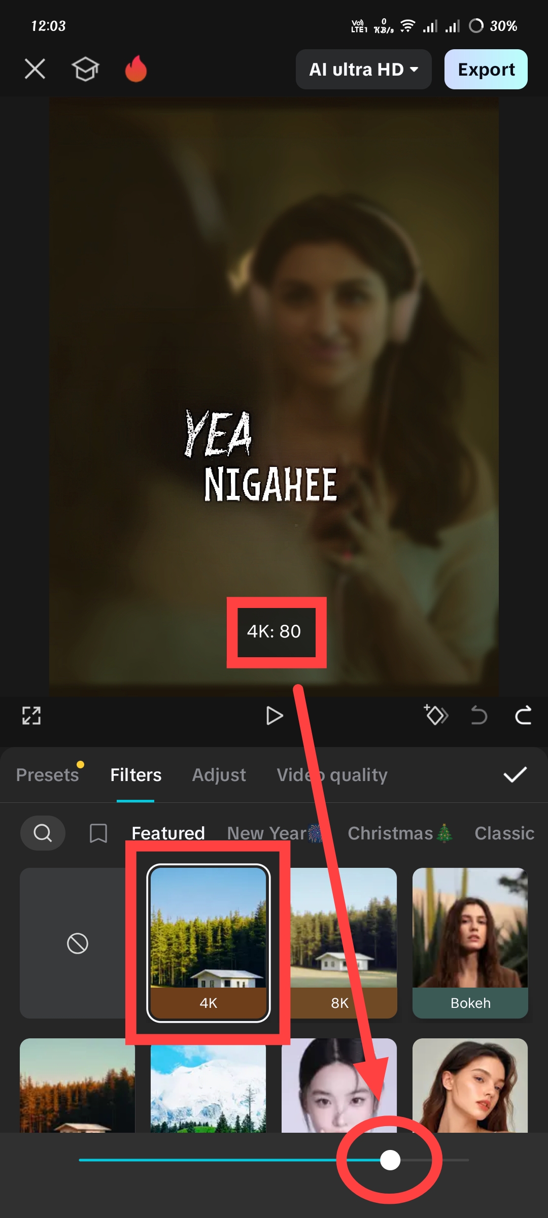 এরপর Adjust এর মধ্যে আবার ক্লিক করে Filters-এ গিয়ে শুরুতেই 4K Filter দেখতে পেয়েছি এবং ক্লিক করে এটাকেও ৮০ পর্যন্ত করেছি । এরপর এটাকে ভিডিও এর শুরু থেকে শেষ পর্যন্ত সেট করে দিয়েছি অর্থাৎ (০.০-২০.৩) ।
