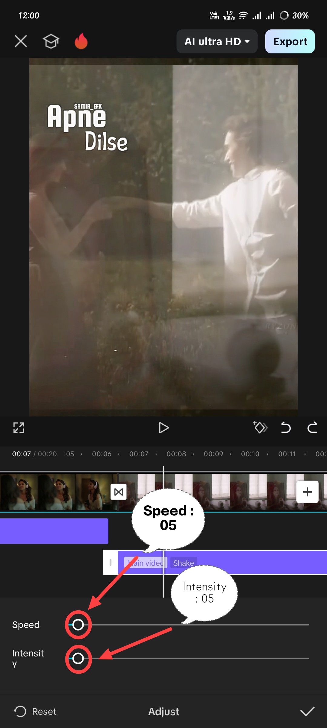 এরপরে আবার Effects অপশনে গিয়ে সার্চ করেছি shake এবং প্রথমে যেটা এসেছে সেটাতে ক্লিক করেছি । ক্লিক করার পর shake এডজাস্ট অপশনে গিয়ে Speed : 05, Intensity : 05 রেখেছি । এই ইফেক্টটাকে ভিডিও এর ৬.৫- ২০.৩ সেকেন্ড পর্যন্ত রেখেছি ।