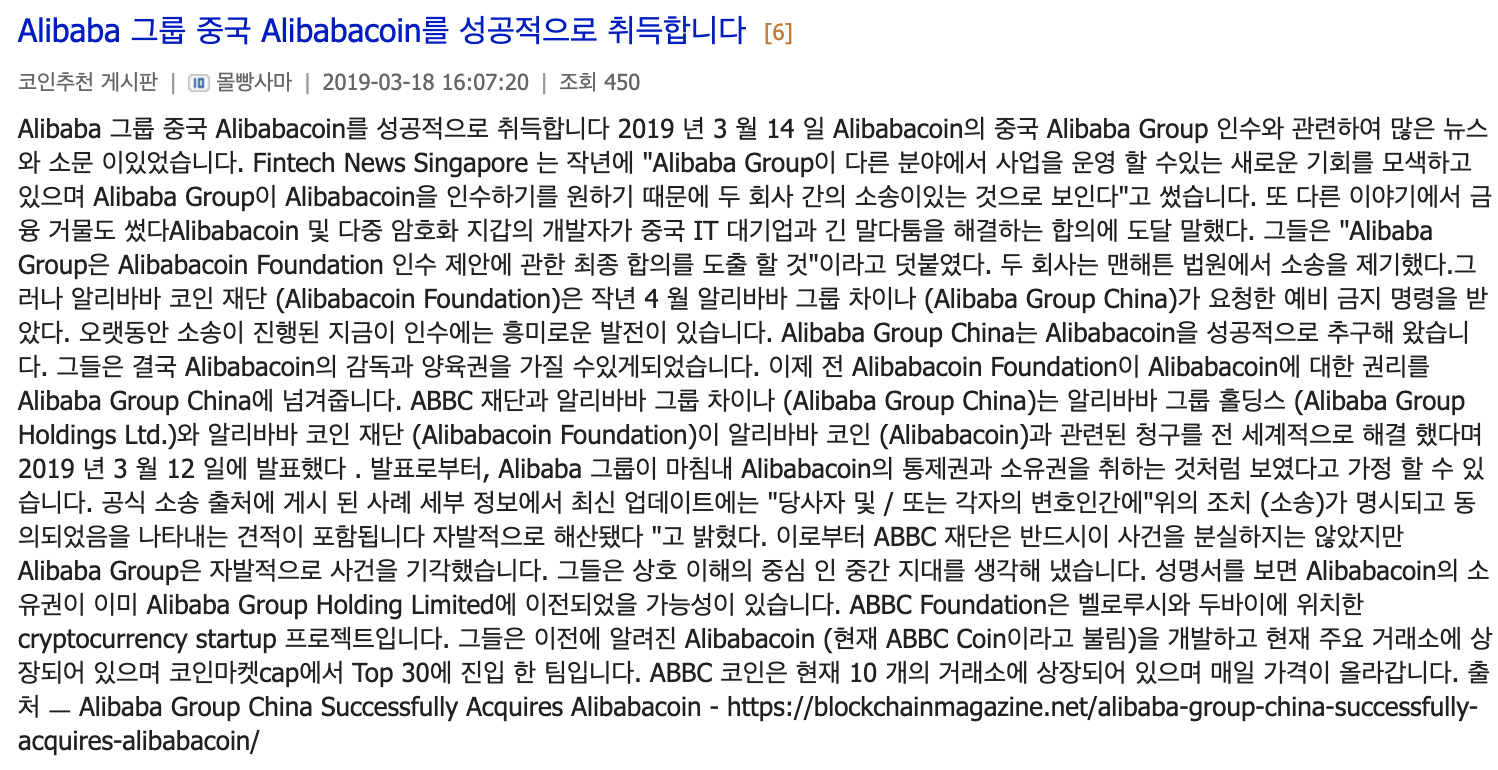 알리바바 코인 인수가 아니라, 알리바바 코인이라는 상표권을 알리바바 그룹이 소유하게 된겁니다.