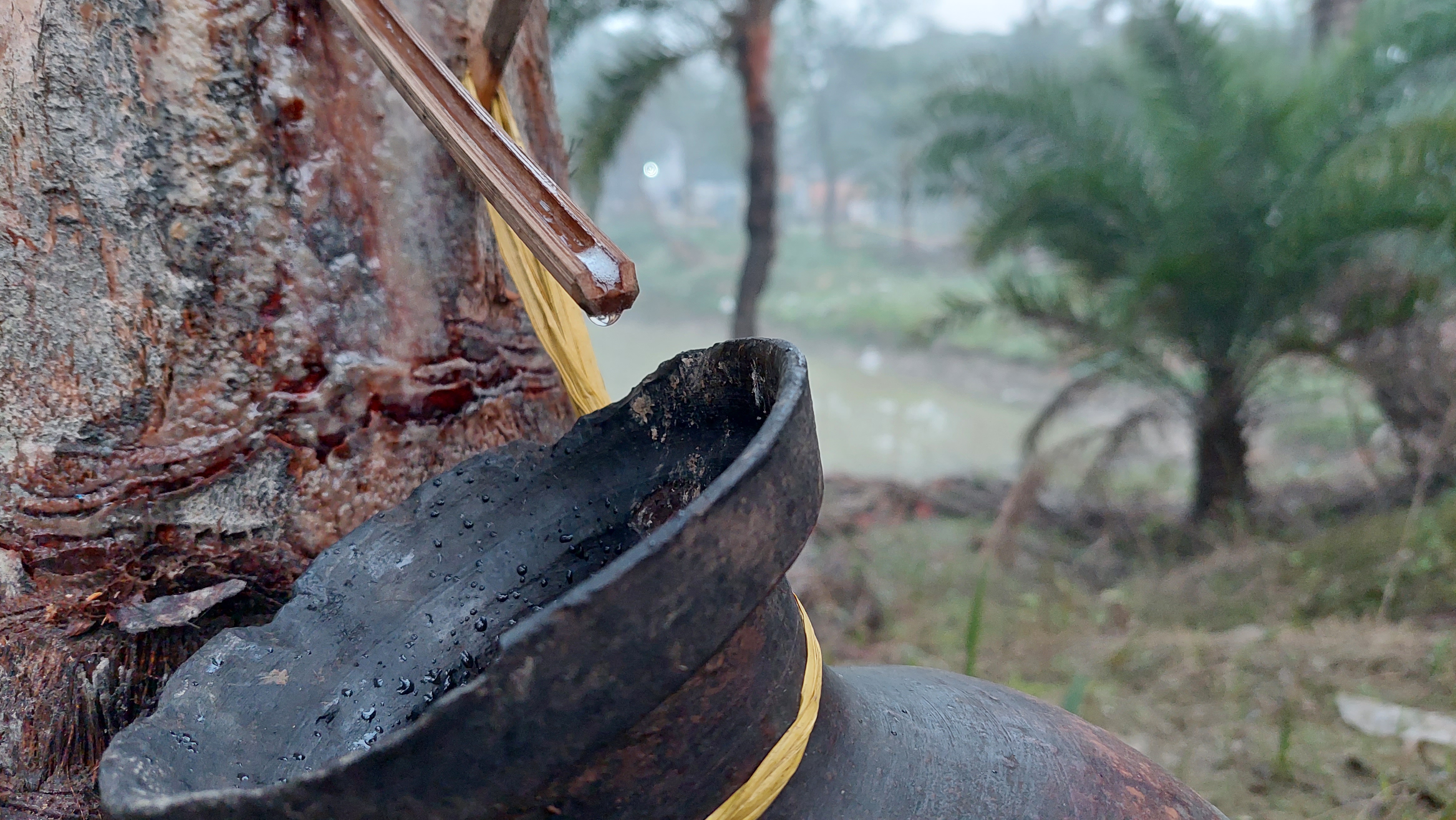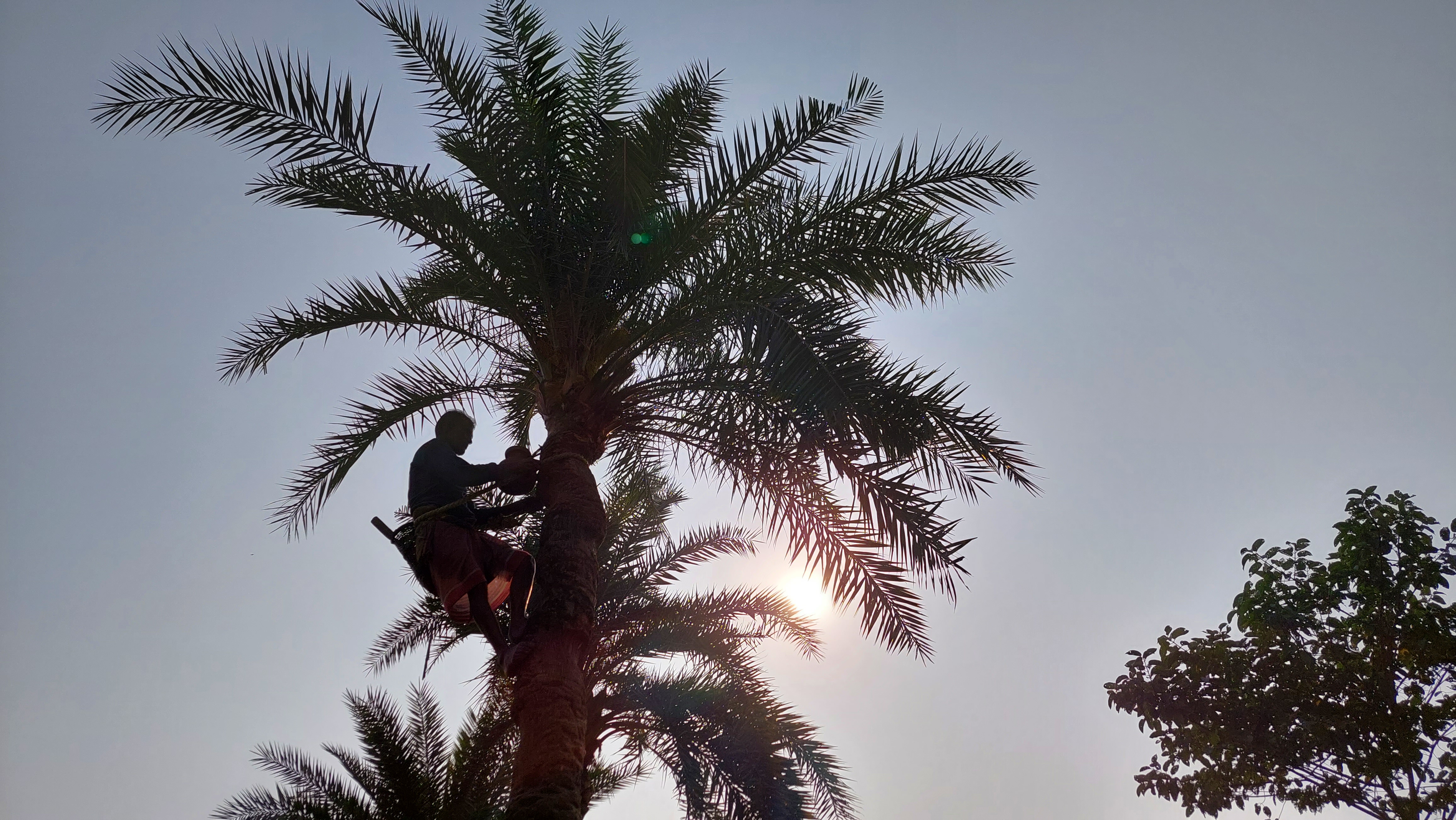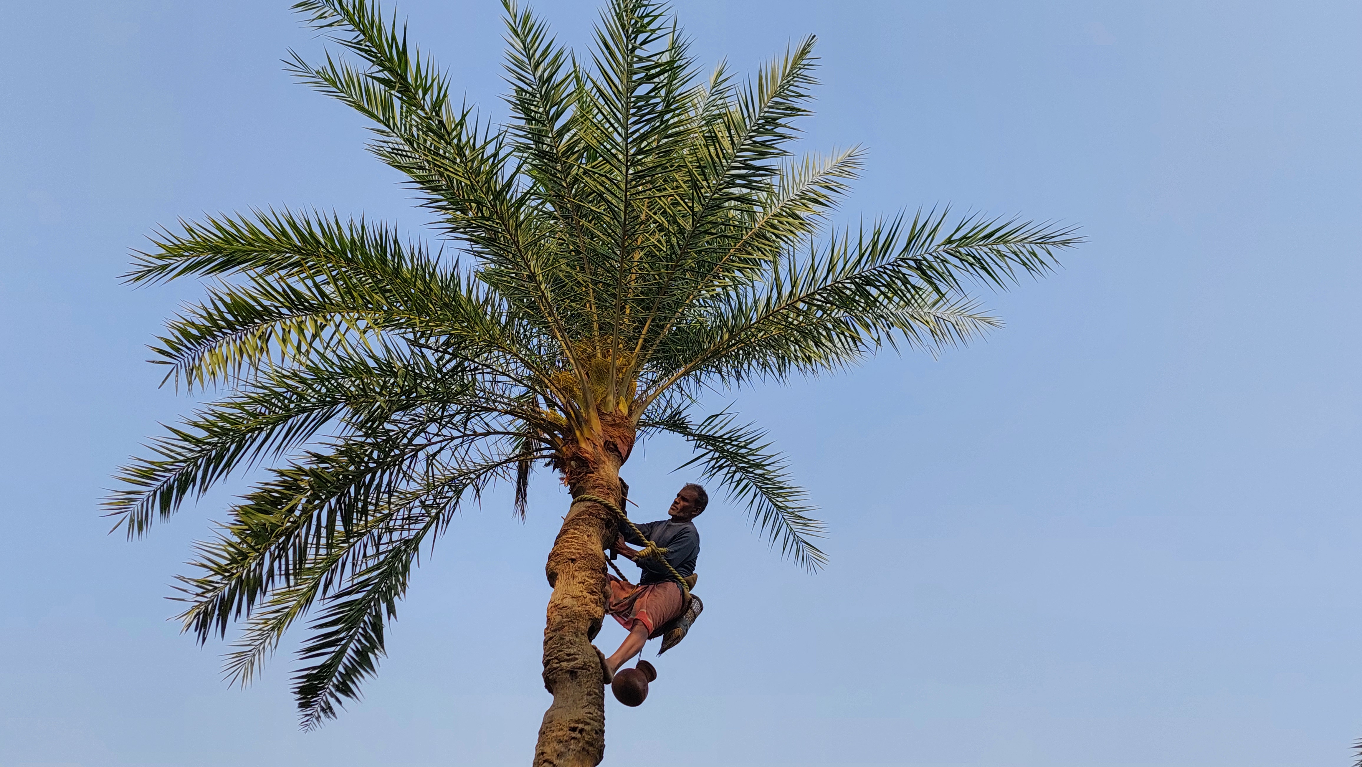 খেজুর গাছে লাগছে দায়ের আঘাত।