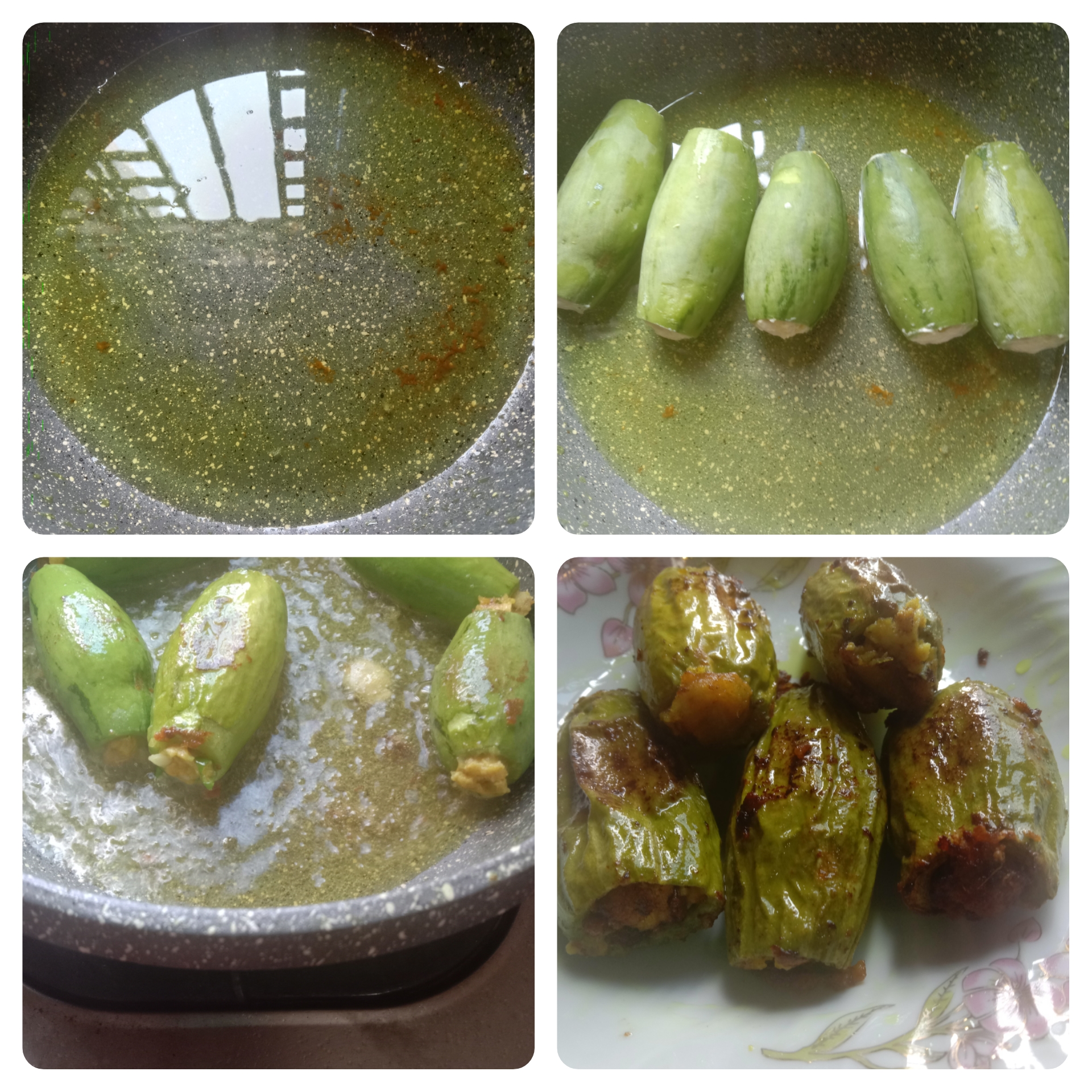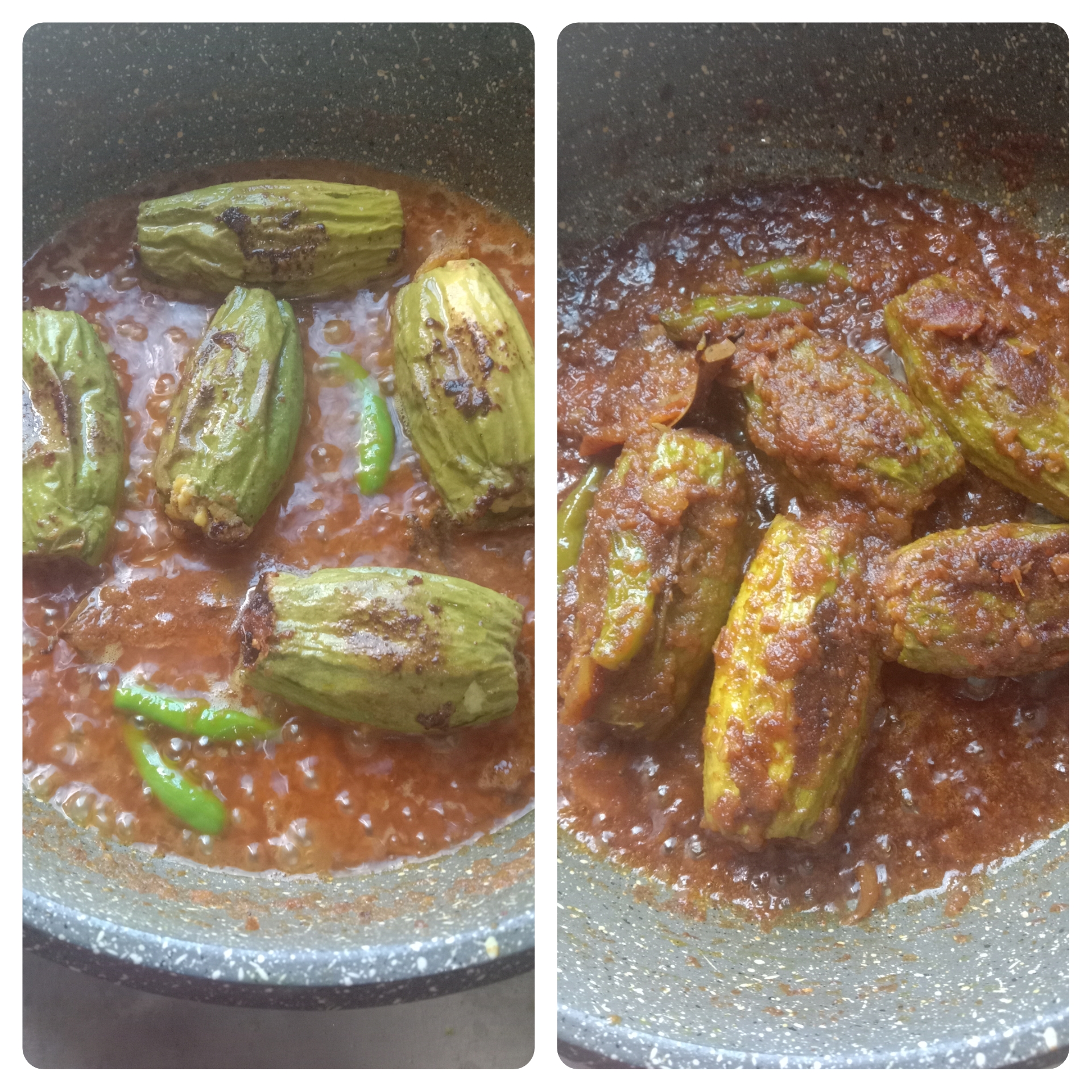 সামান্য জল দিয়ে অল্প আঁচে অনেক সময় ধরে মসলা গুলো খুব ভালো করে কষিয়ে নিয়েছি মসলা কষানো হলে কয়েকটা কাঁচামরিচ দিয়ে আরও কিছুক্ষণ নেড়েচেড়ে অল্প জল দিয়ে পটল গুলো ছেড়ে দিয়েছি। তারপর একটা ঢাকনা দিয়ে ঢেকে দিয়েছি।