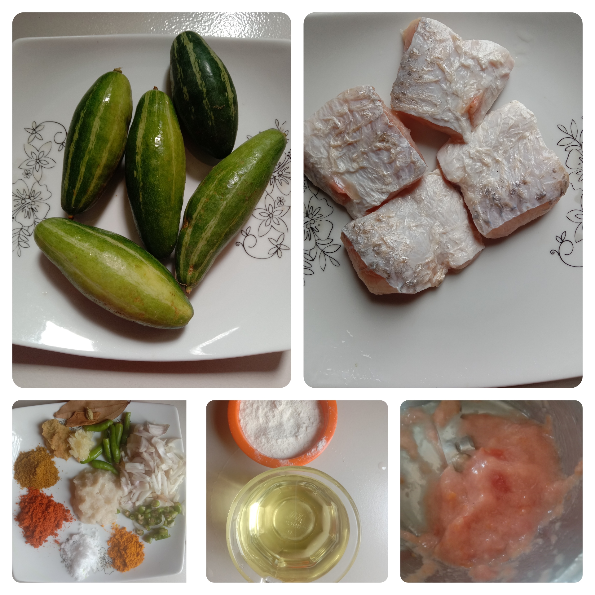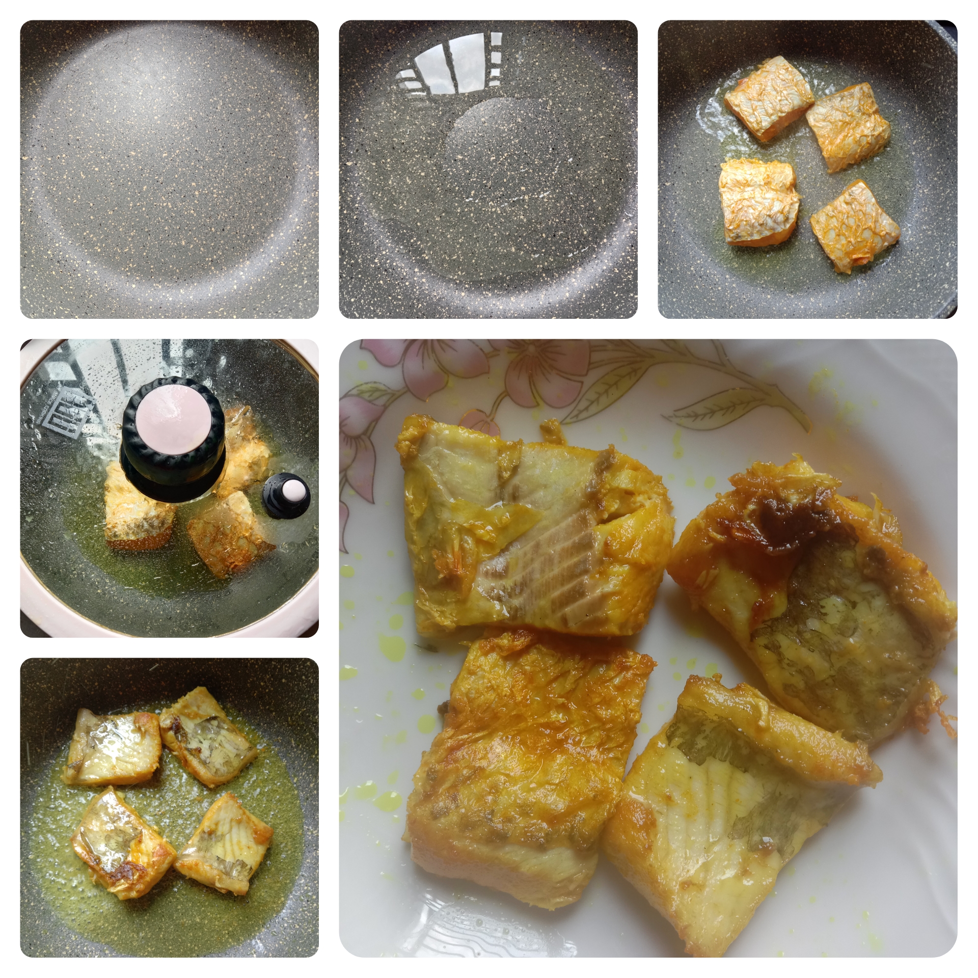 চুলায় একটা কড়াই বসিয়ে দিয়েছি তারপর অল্প পরিমাণে তেল দিয়েছি, তেল গরম হলে মাছের টুকরো গুলো দিয়ে ঢাকনা দিয়ে কিছুক্ষণের জন্য ঢেকে দিয়েছি যাতে করে মাছের টুকরো গুলো সিদ্ধ হয়।খুবই অল্প আঁচে একপাশ ভেজে নিয়েছি তারপর উল্টিয়ে দিয়ে দুপাশে হালকা করে ভেজে নিয়েছি।
