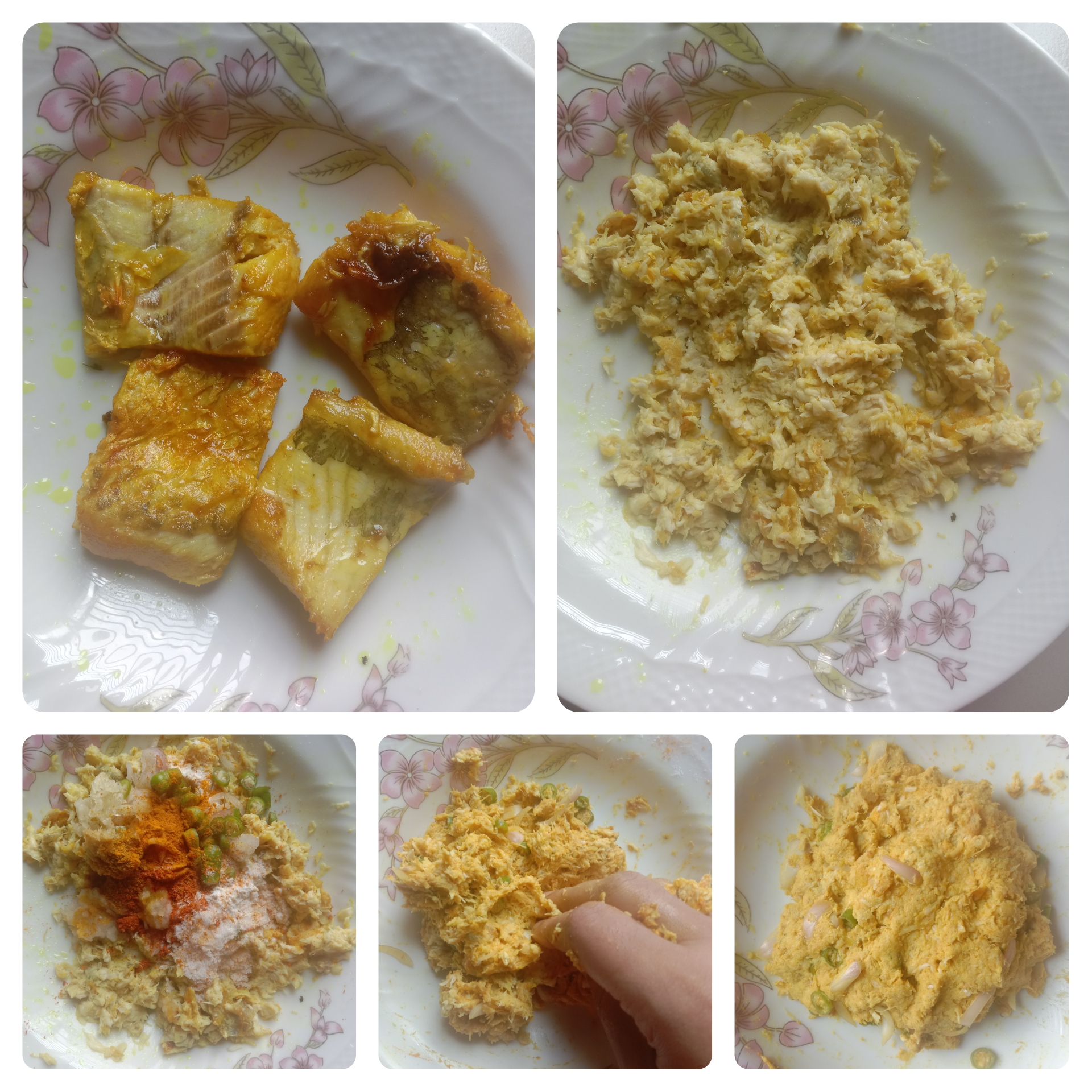 মাছ ভাজা গুলো ঠান্ডা হলে কাটা বেছে নিয়ে তারমধ্যে লবন,হলুদের গুঁড়া, মরিচ কুঁচি, পেঁয়াজ কুঁচি, রসুন বাঁটা সামান্য জিরাগুঁড়া আর খুবই অল্প পরিমাণে ময়দা দিয়ে ভালো করে মেখে নিয়েছি।