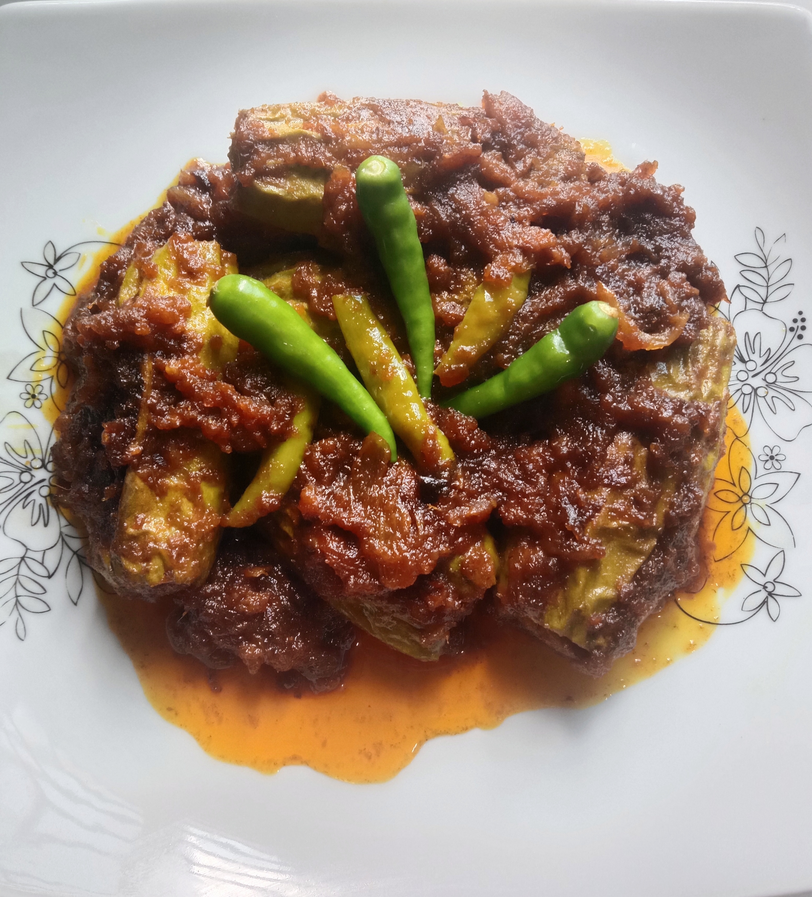 চুলা থেকে নামিয়ে কিছুক্ষণের জন্য ঢাকনা দিয়ে দমে রেখেছি। তারপর একটা প্লেটে উঠিয়ে নিয়েছি। উপর দিয়ে কাঁচামরিচ দিয়ে সাজিয়ে নিয়েছি। পরিবেশনের জন্য প্রস্তুত রুই মাছের পুর ভরা পটলের তেল ঝাল।