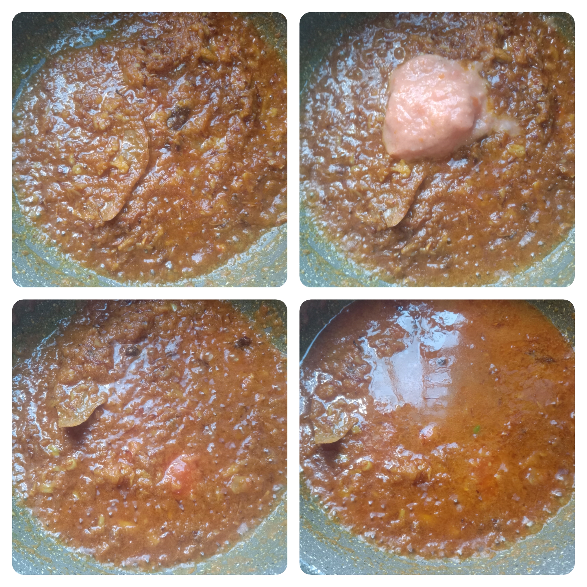 মসলা গুলো দিয়ে ভালো করে মিশিয়ে নিয়েছি তারপর টমেটো পেস্ট গুলো দিয়ে মিশিয়ে নিয়েছি তারপর সামান্য জল দিয়ে দিয়েছি।