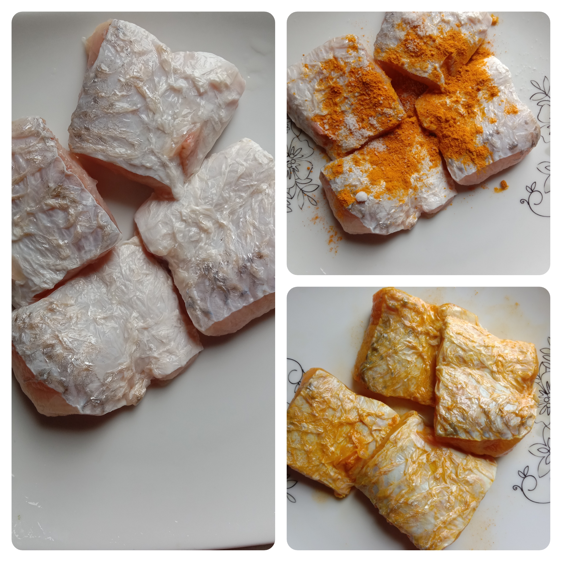 রুই মাছের পেটির অংশ চার টুকরো নিয়ে ভালো করে ধুয়ে নিয়েছি। তারপর লবন হলুদ গুঁড়া দিয়ে মাখিয়ে নিয়েছি।