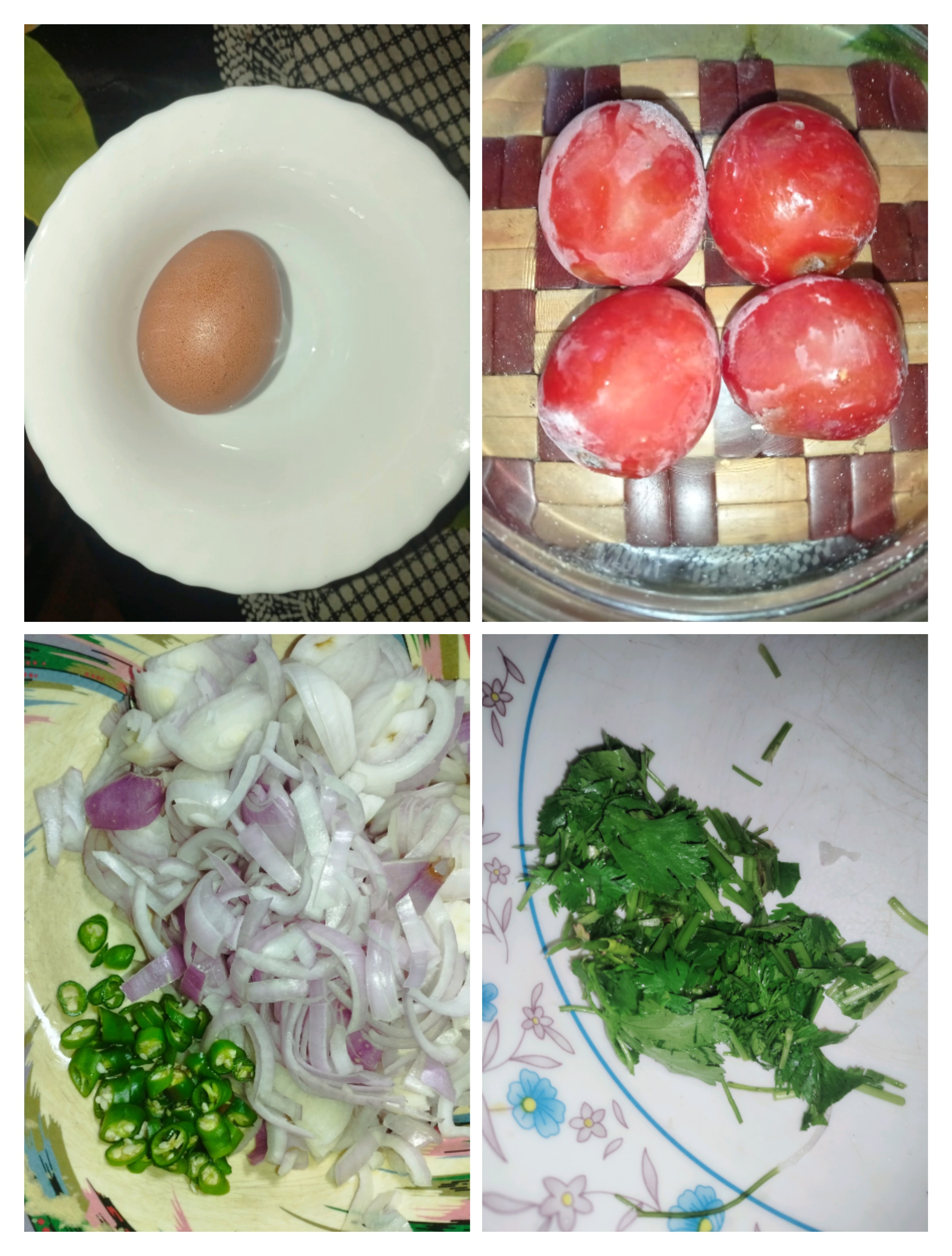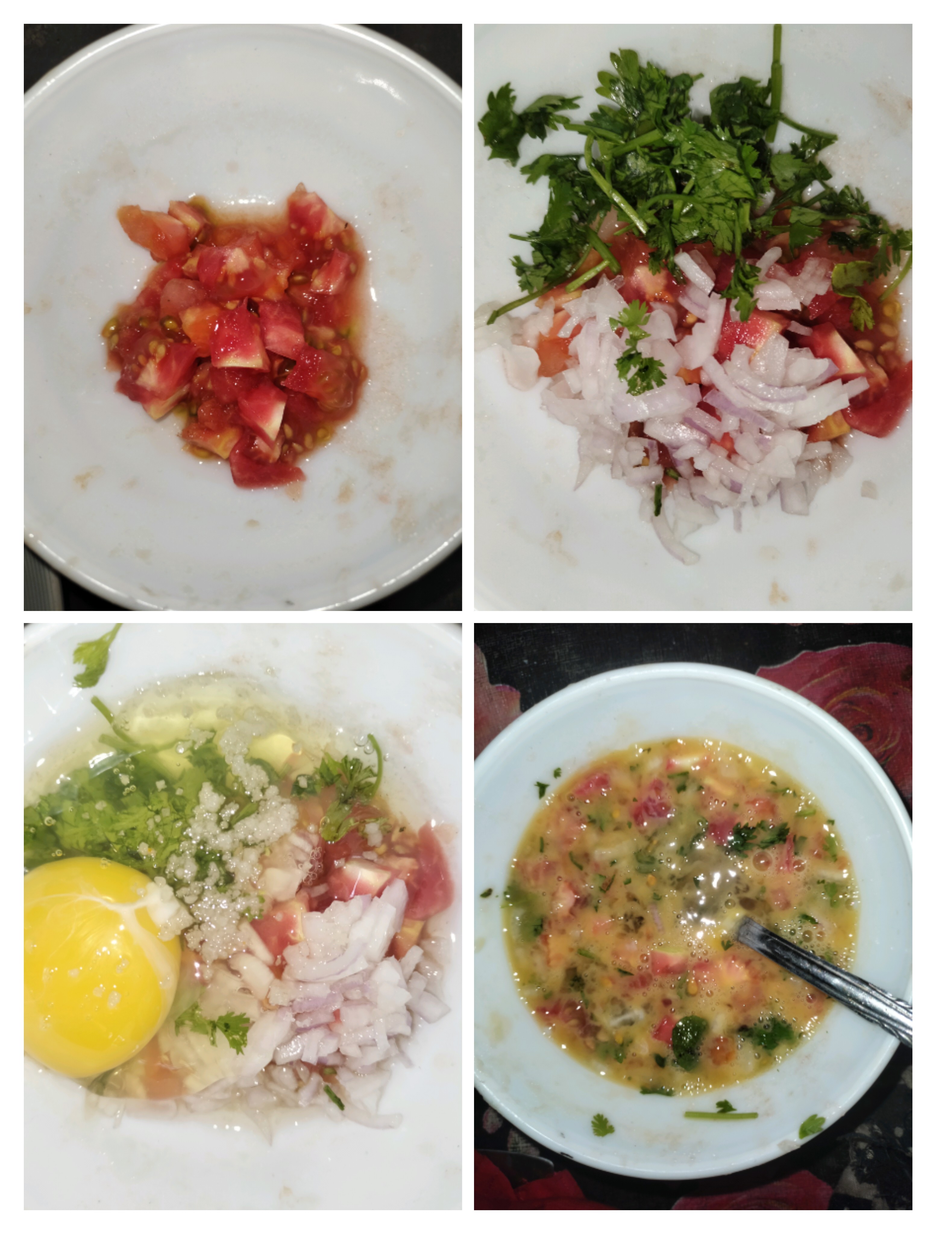 এরপর আমি টমেটোর ভেতরের অংশটা কুচি করে নিয়েছি। এখানে আমি খুশি করা পেঁয়াজ এবং কুচি করা ধনিয়া পাতা দিয়ে দিলাম। তার সাথে আমি দিয়ে দিলাম লবন এবং একটা ডিম। এরপর সবগুলো আমি মিশিয়ে নিলাম।