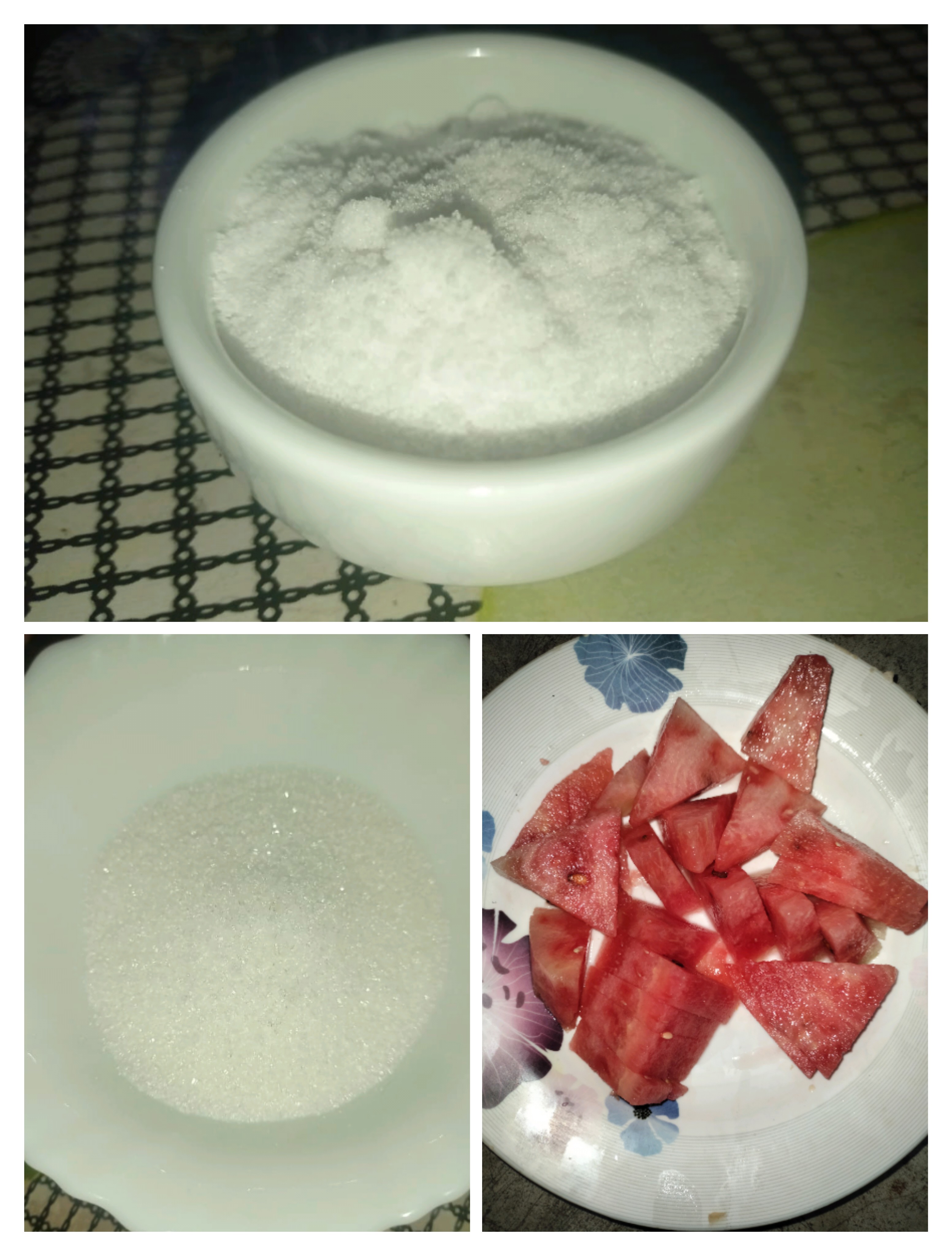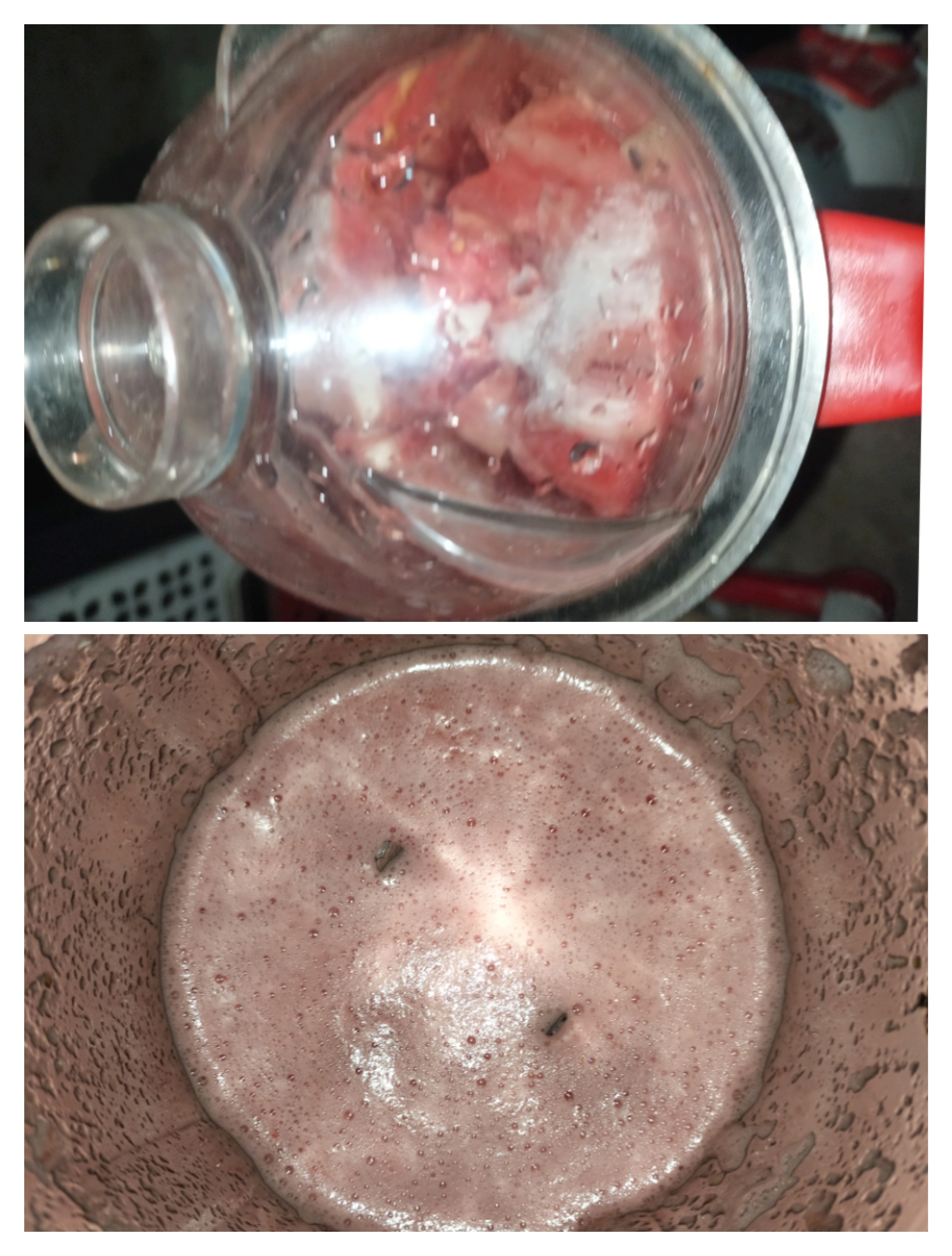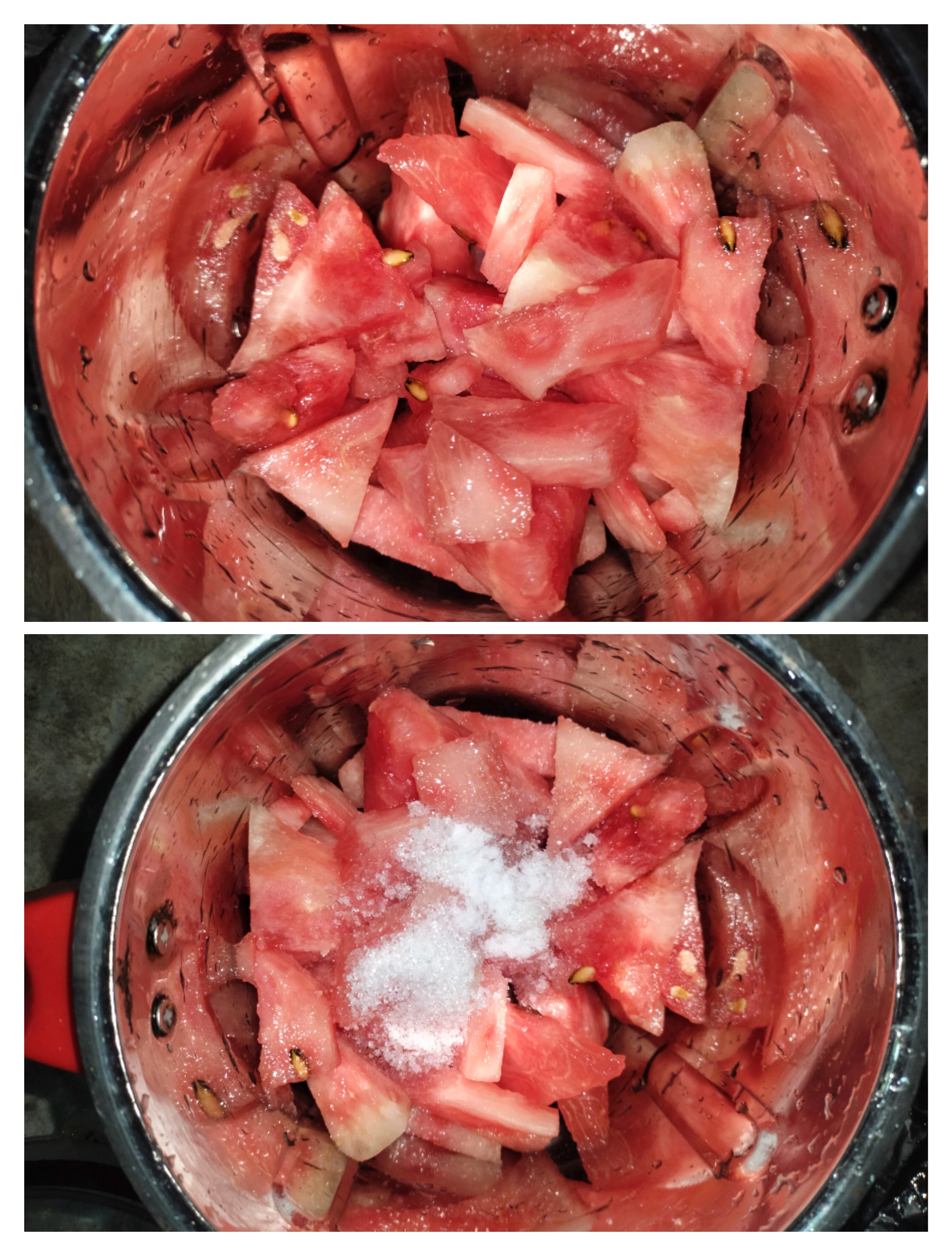 প্রথমে আমি তরমুজগুলোকে ছোট ছোট টুকরো করে কেটে নিলাম। এরপর আমি একটা ব্লেন্ডারের জাগে নিয়ে নিলাম। এরপরের মধ্যে চিনি এবং লবণ দিয়ে দিলাম।