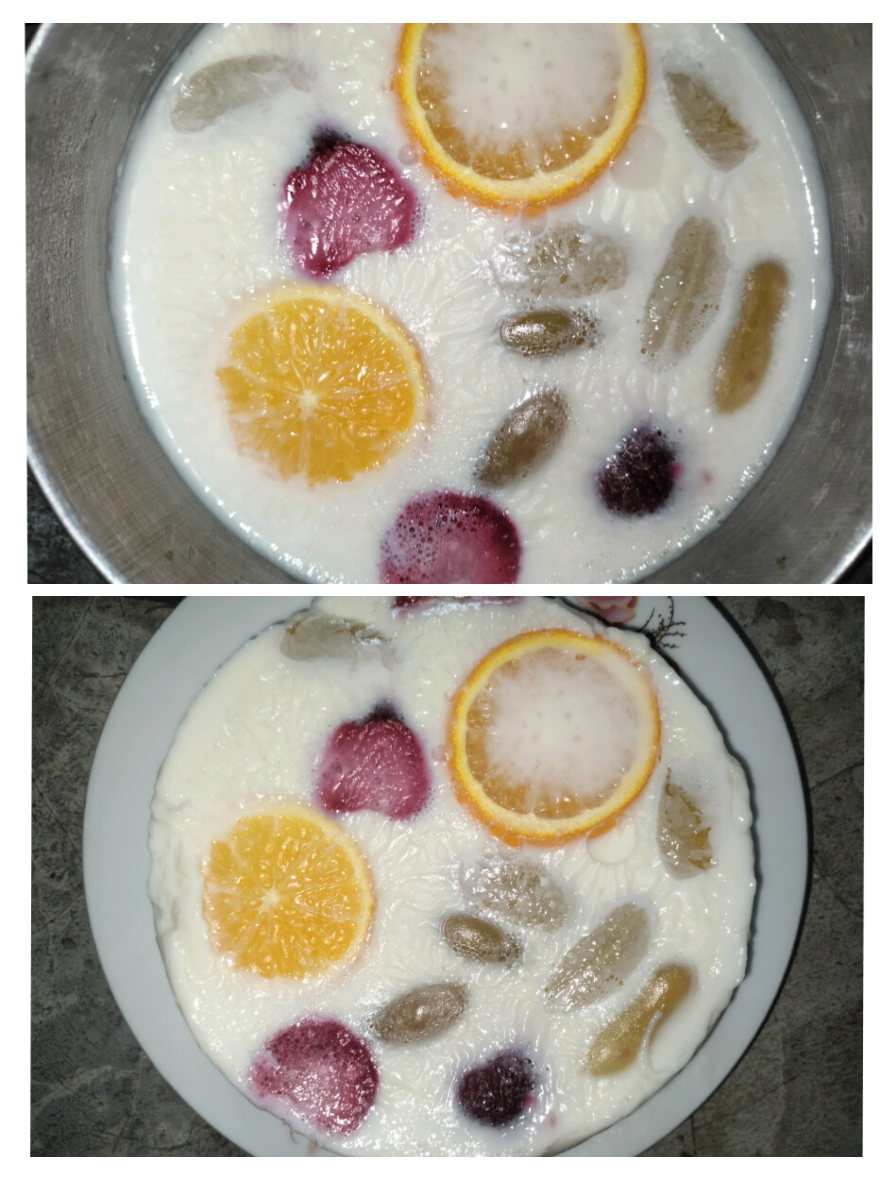 এরপরে দুধ টাকে চুলা থেকে নামিয়ে এই বাটিতে মধ্যে আস্তে আস্তে ঢেলে নিলাম। এরপর কিছুক্ষণ ঠান্ডা করে এটাকে ফ্রিজে রেখে দিব।